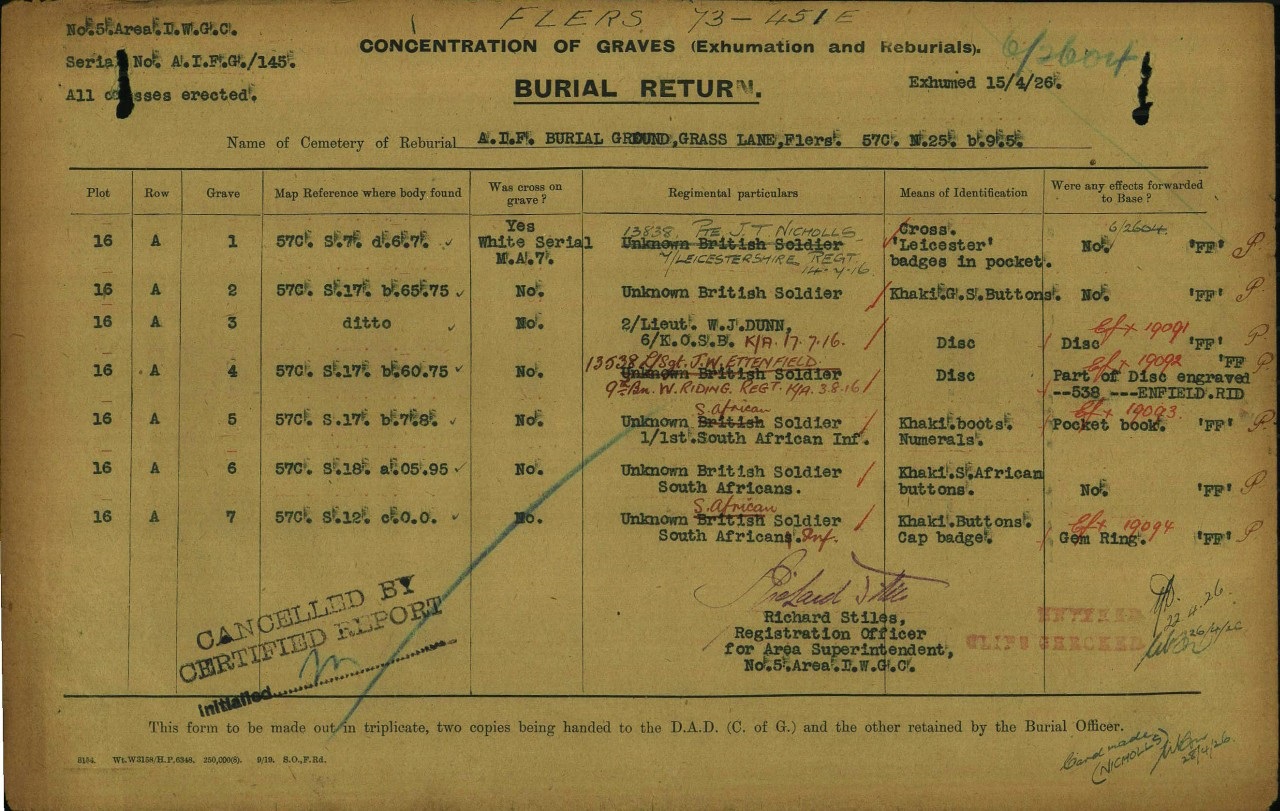 Found at Map Reference 57c.S.12.c.0.0 or GPS 50.0285, 2.8076. This is the Western edge of Delville Wood. One can assume he died during the fighting of July 1916. His means of identification were: khaki, buttons, cap badge. A gem ring was sent in for effects #19094