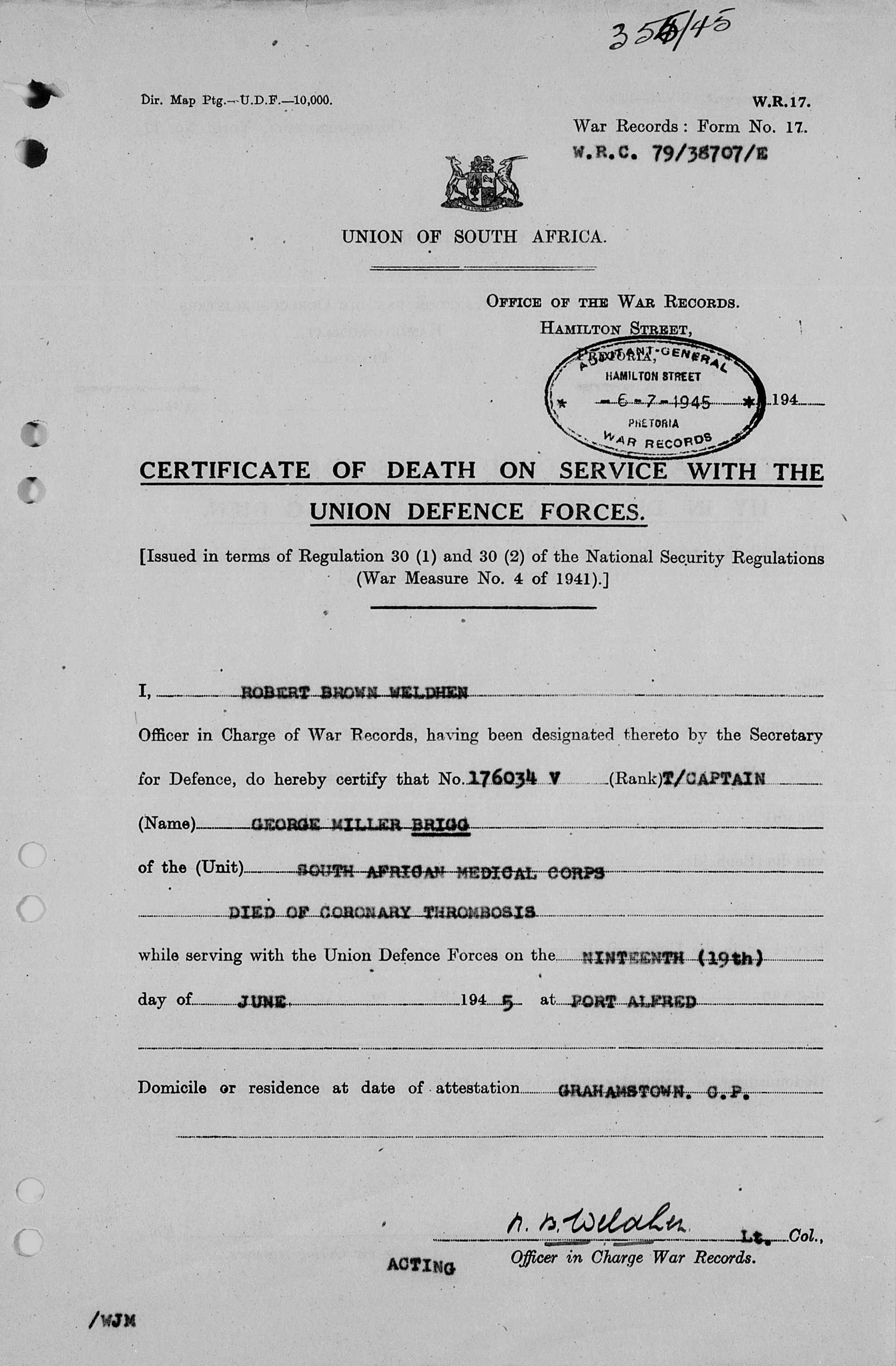 Son of Charles and Louisa Brigg; husband of Estelle W. Brigg, of Granhamstown.