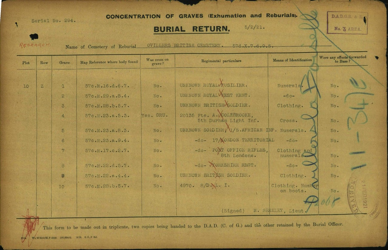 Found at Map Reference 57c.M.23.a.8.3. (or 50.0666, 2.7987). Found East of the village of Le Sars, so one can likely assume he died during the fighting of Delville Wood July 1916 or Warlencourt October 1916. His means of identification were: Numerals
