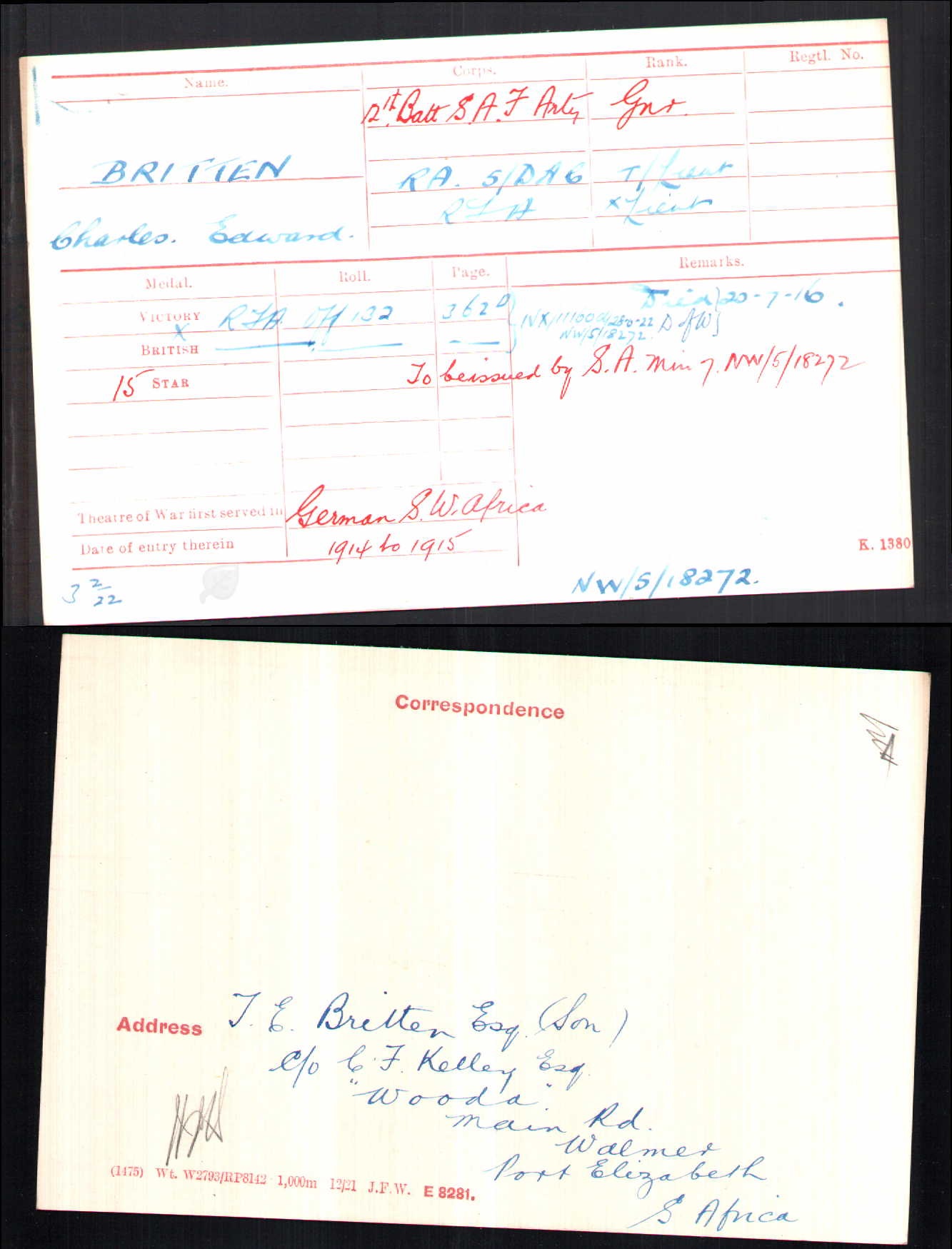 Son of Alice Anne and the late William Edward Britten, of Hereford. Next-of-kin listed as C. F. Kelly, of Walmer, Port Elizabeth. Born on March 6, 1876, in Stapleton, Co. Hereford. He was the son of William Edward Britten, who was secretary of the Hereford Herd Book Society and a well-known local figure in the cattle business. From 1889 to 1893 Charlie attended the Hereford Cathedral School, where he played centre three-quarter for the rugby team, and won the sixteen-mile "Hare and Hounds". Upon leaving school, he worked in a bank for a few years, then volunteered for the Imperial Yeomanry during the Boer War and served in the 13th (Shropshire) Company as a trooper in 1900-01. After that war, he worked as a mining engineer on the gold mines in Rhodesia and Johannesburg. He married Helen Nicholson Templeton in the Pro-Cathedral, Salisbury, Rhodesia, on July 8, 1908. His wife was a Scottish widow who travelled from Scotland with a friend as chaperone, travelling the last 2,000 miles to Salisbury by ox-wagon. She bore him one son in 1909 in Rhodesia, and later died in childbirth in Johannesburg in 1913. At the outbreak of WWI in 1914, Charlie was working at the Wolhuter Mine in Johannesburg. He resigned immediately and volunteered for the Cape Artillery, serving as a Gunner in the 12th Citizen Battery of that regiment during the invasion of German South-West Africa by the Union forces. At the end of that campaign, he returned to England, leaving his son Tommy in the care of friends in South Africa. He applied for and was granted a Temporary Commission "for the duration of the war" in September 1915, and on October 1st he was gazetted "Second Lieutenant (on probation)", in the Royal Field Artillery, as a member of the Special Reserve of Officers. While serving with the 5th Division Ammunition Column during the battle of the Somme, he received gunshot wounds to the chest and thigh on July 25th, 1916. He was removed to No. 2 Stationary Hospital in Abbeville, where he died on July 29th. Commemorated on the war memorial of Ol Herefordians in Hereford Cathedral, the Tupsley War Memorial, and the Cenotaph in Port Elizabeth, South Africa. Through his son Tommy he currently has living descendants in the UK, the USA, the Channel Islands, South Africa, Iceland, Jordan, and Thailand. ref. South African Roll of Honour 1914-1918 |