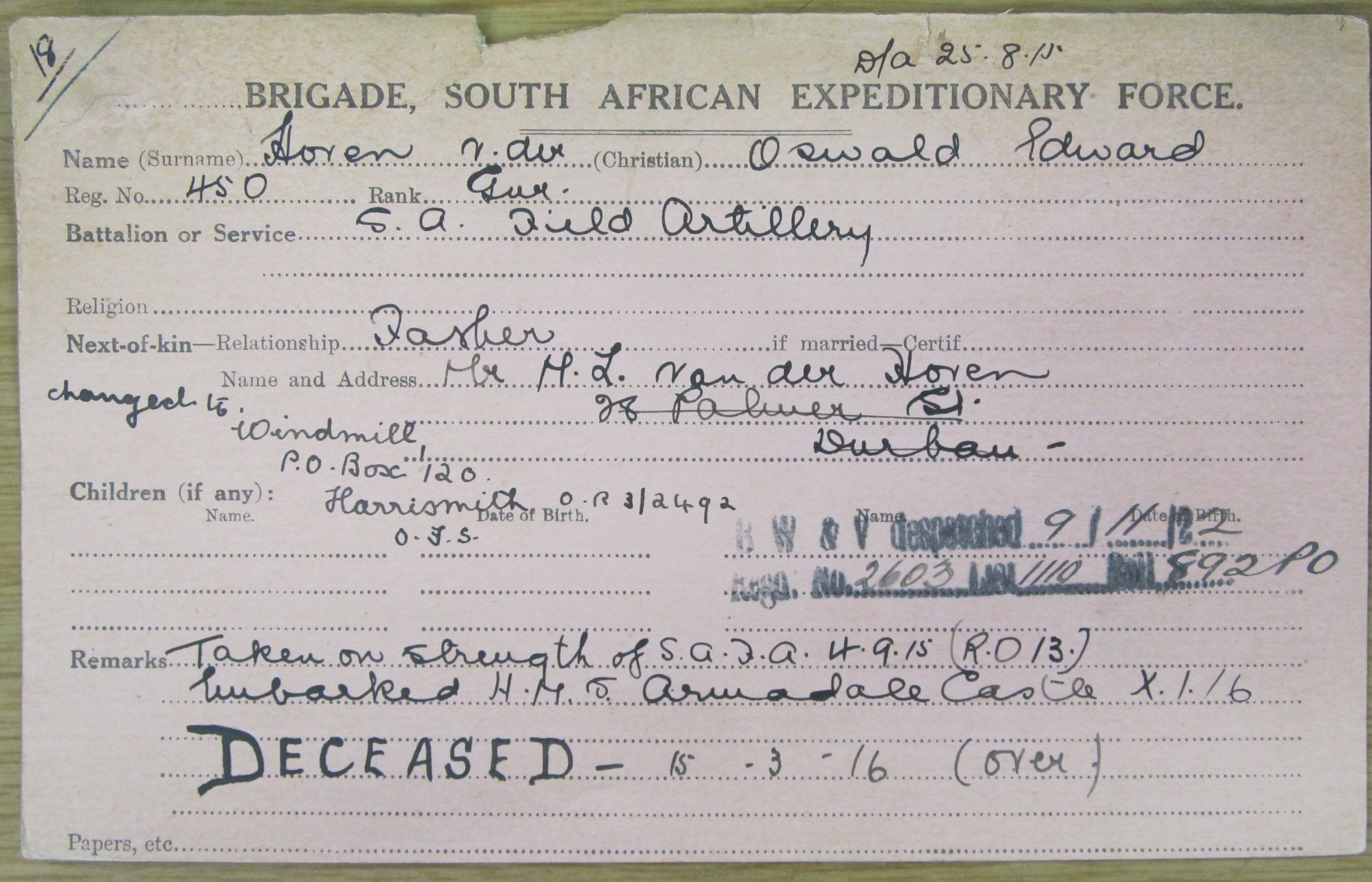 Son of Martinus Lourens and Margaret Kate Van der Hoven, of 29c, Bezuidenhout St., Troyeville, Johannesburg, Transvaal. Born Willowmore, Cape Province. A clerk and forwarding agent.