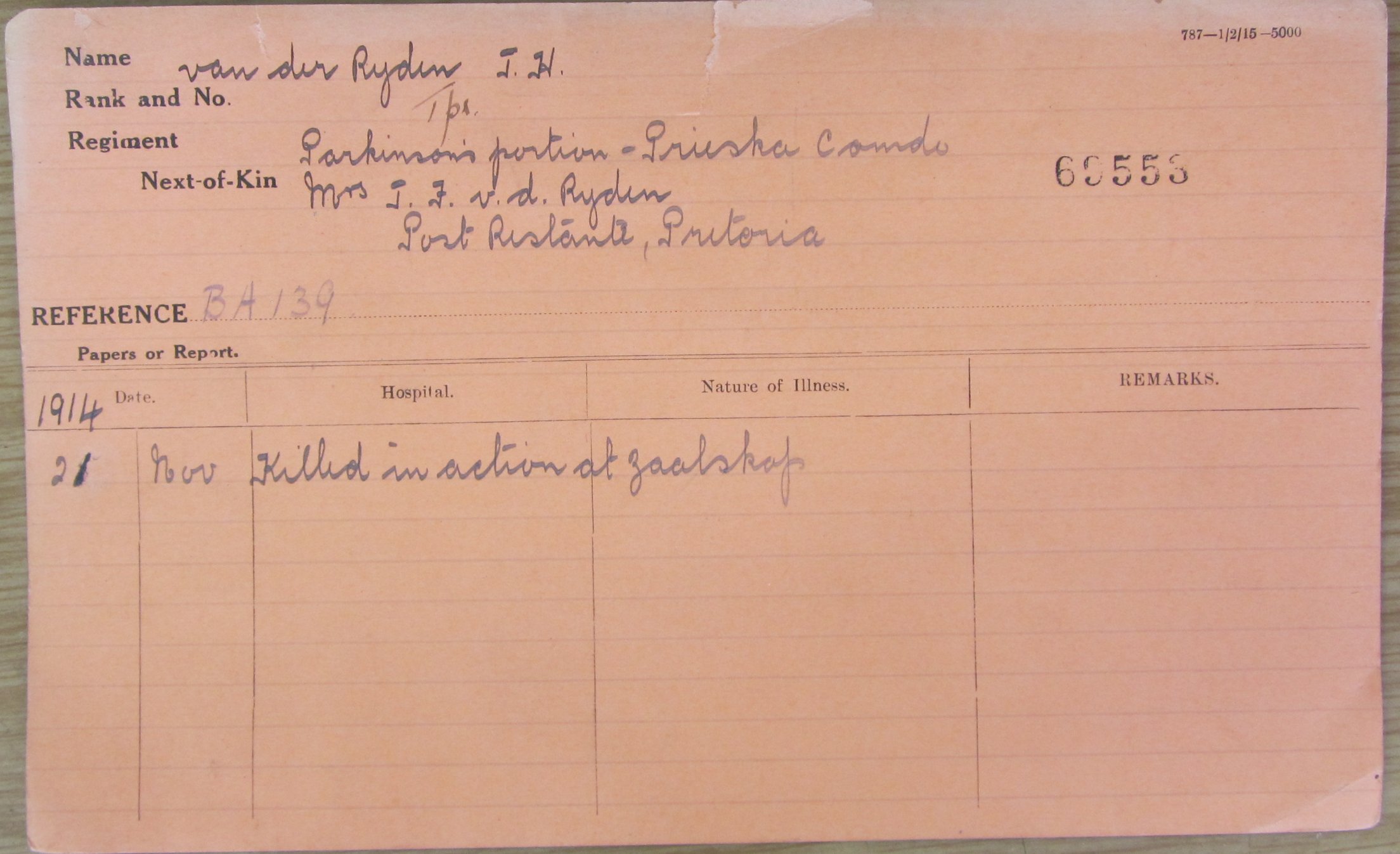 Next of kin, Mrs. J. F. van der Ryden, of Pretoria. Alternative Commemoration - buried in Grootdrink Farm Cemetery, Cape Province. ***Date of death on record = 21 November 1914