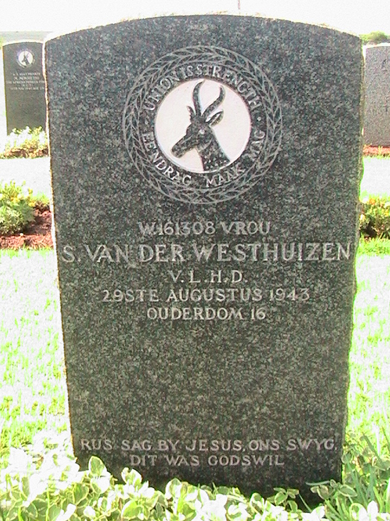 Daughter of Johannes Cornelis and Jacoba Maritza van der Westhuizen, of Soutbos, District Kroonstad. Born Krugersdorp.