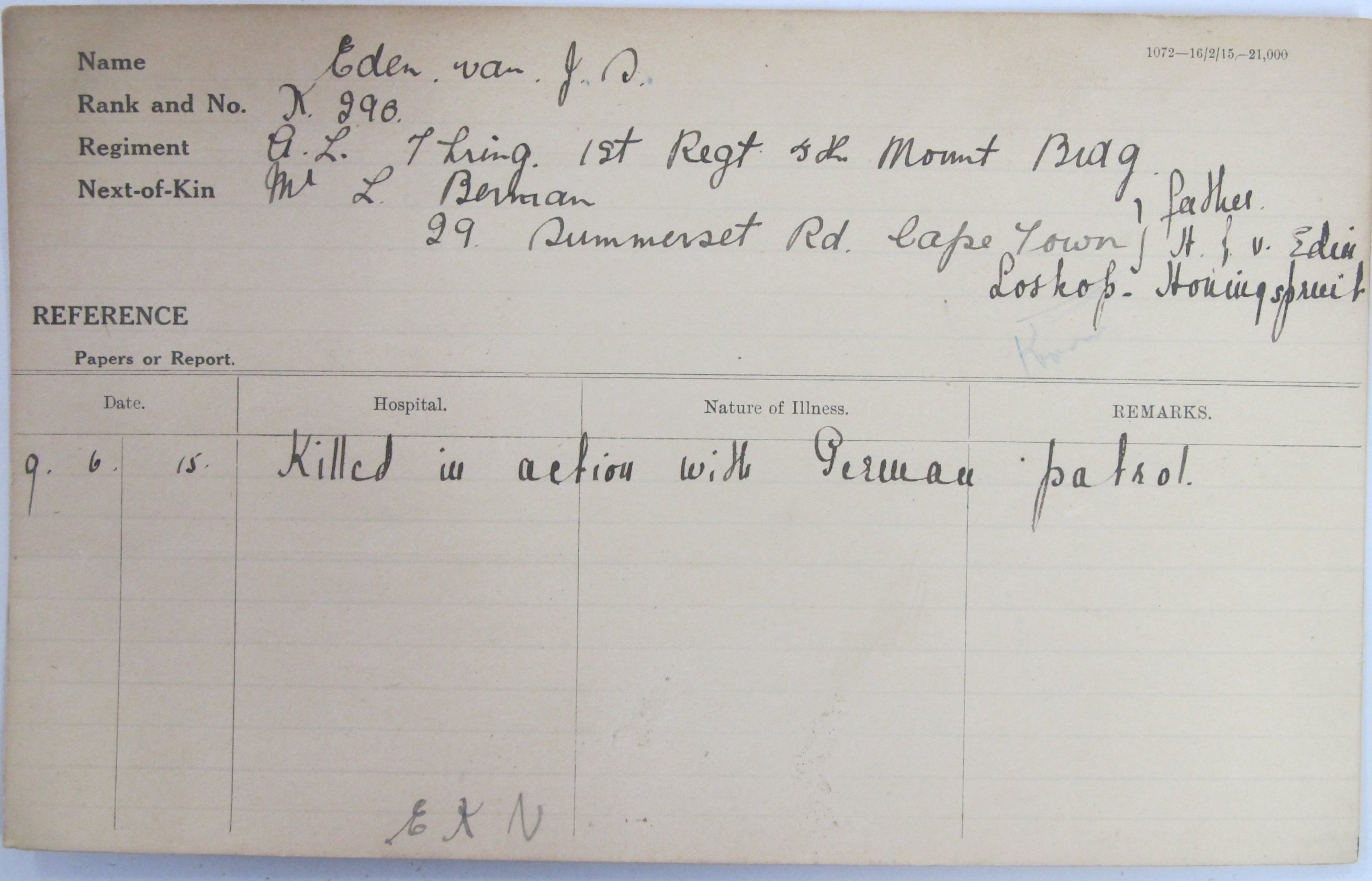 Son of Frederick Hendrik Jacobus and Elizabeth Hester Magdalena van Eden, of Loskop, Honingspruit. A farmer. ***Might be VAN EDEN |