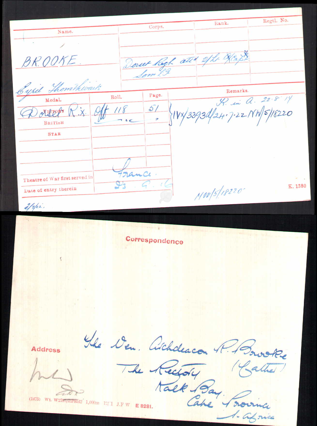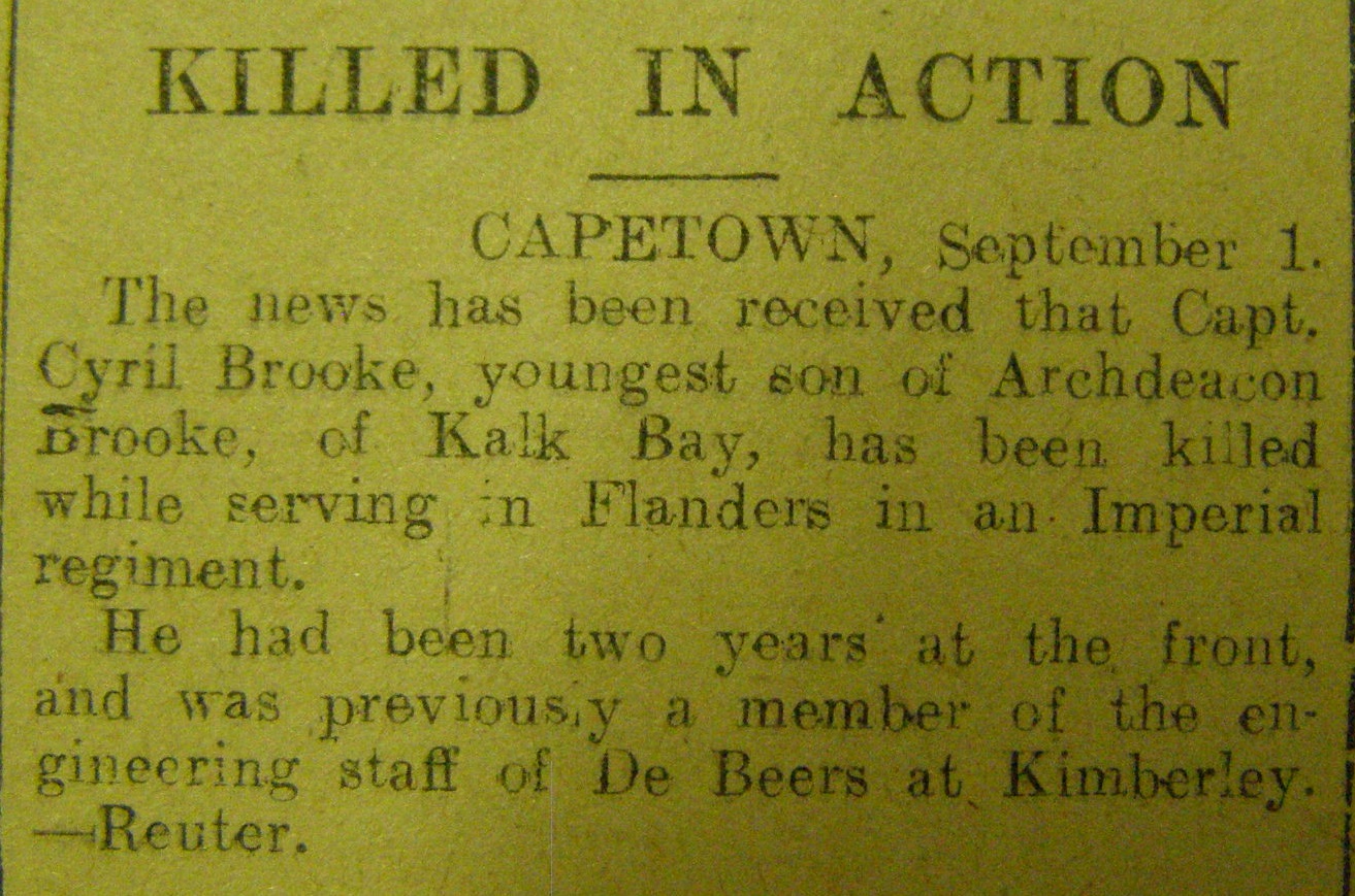 Son of Richard Brooke (Archdeacon of the Cape) and Mary Sophia Brooke, of "Oak Villa," Duke Rd., Rondebosch, Cape Province, South Africa. Also served in German South West Africa, with the Cape Highlanders.
