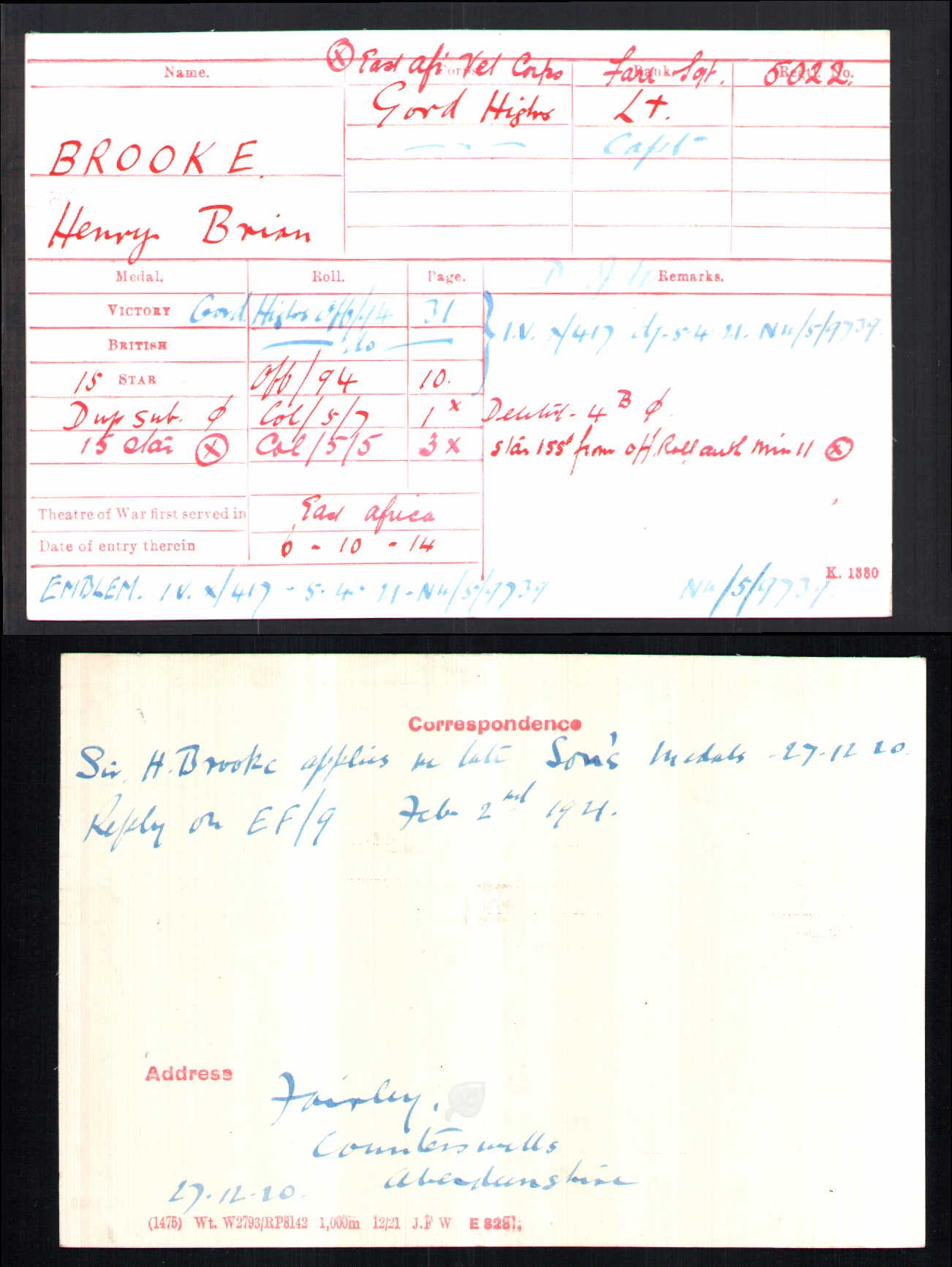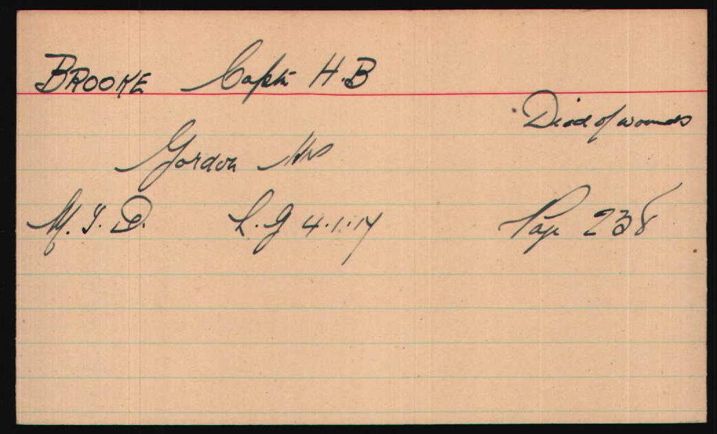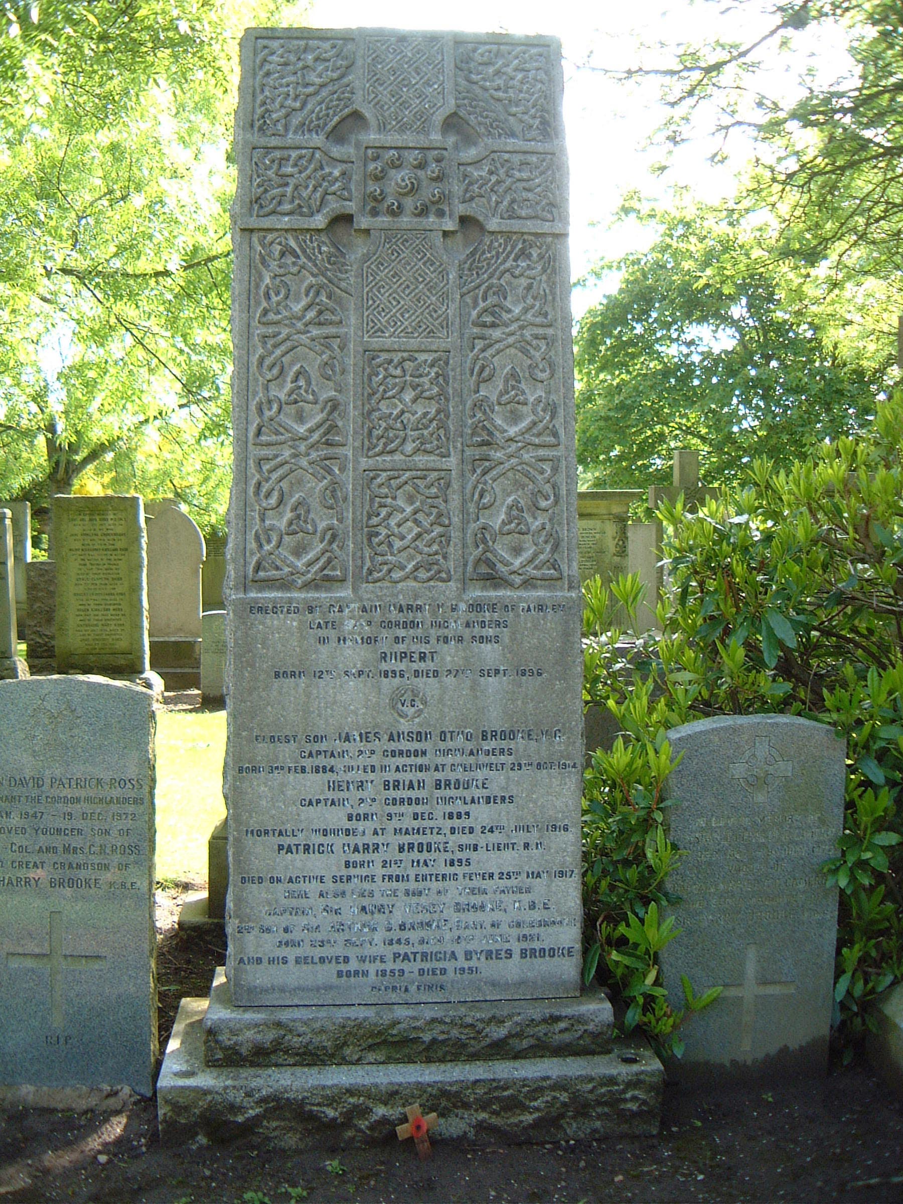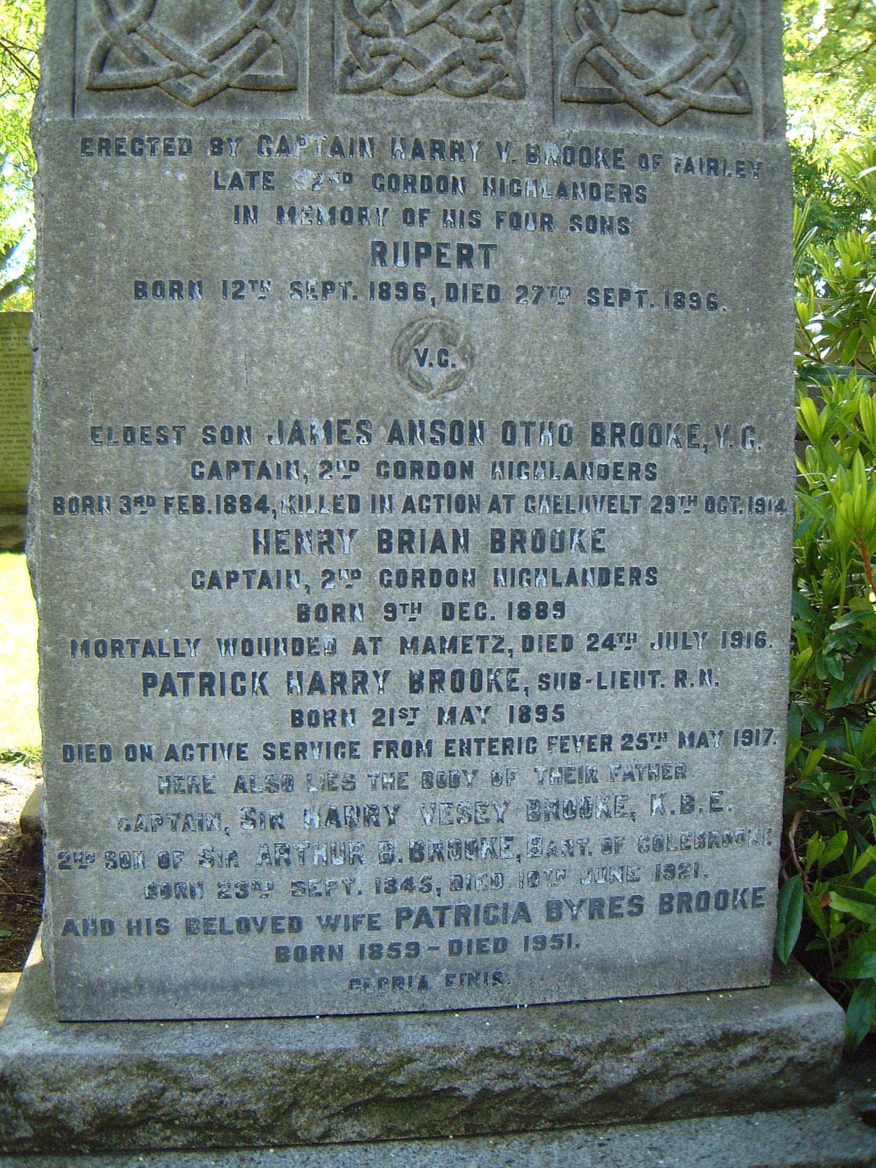 Son of Sir Harry Vesey Brooke, K.B.E., and Lady Brooke, of Fairley, Countesswells, Aberdeen. Served in British East Africa (wounded) and France (where he was mortally wounded). His brothers James Anson Otho Brooke (V.C.) and Patrick Henry Brooke also died in service. ref. South African Roll of Honour 1914-1918