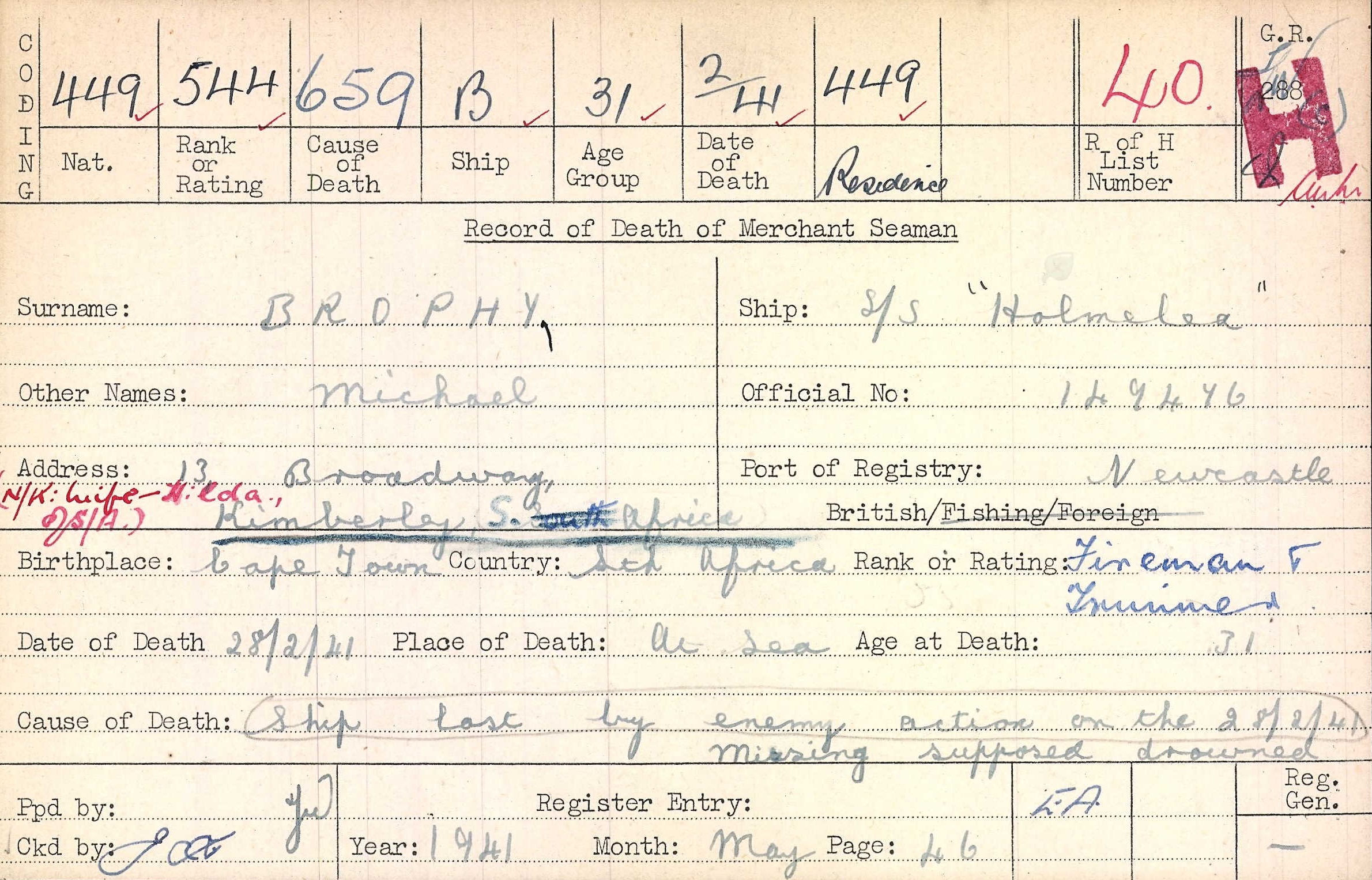 S.S. Holmelea (Newcastle)Other Casualties from this Unit |