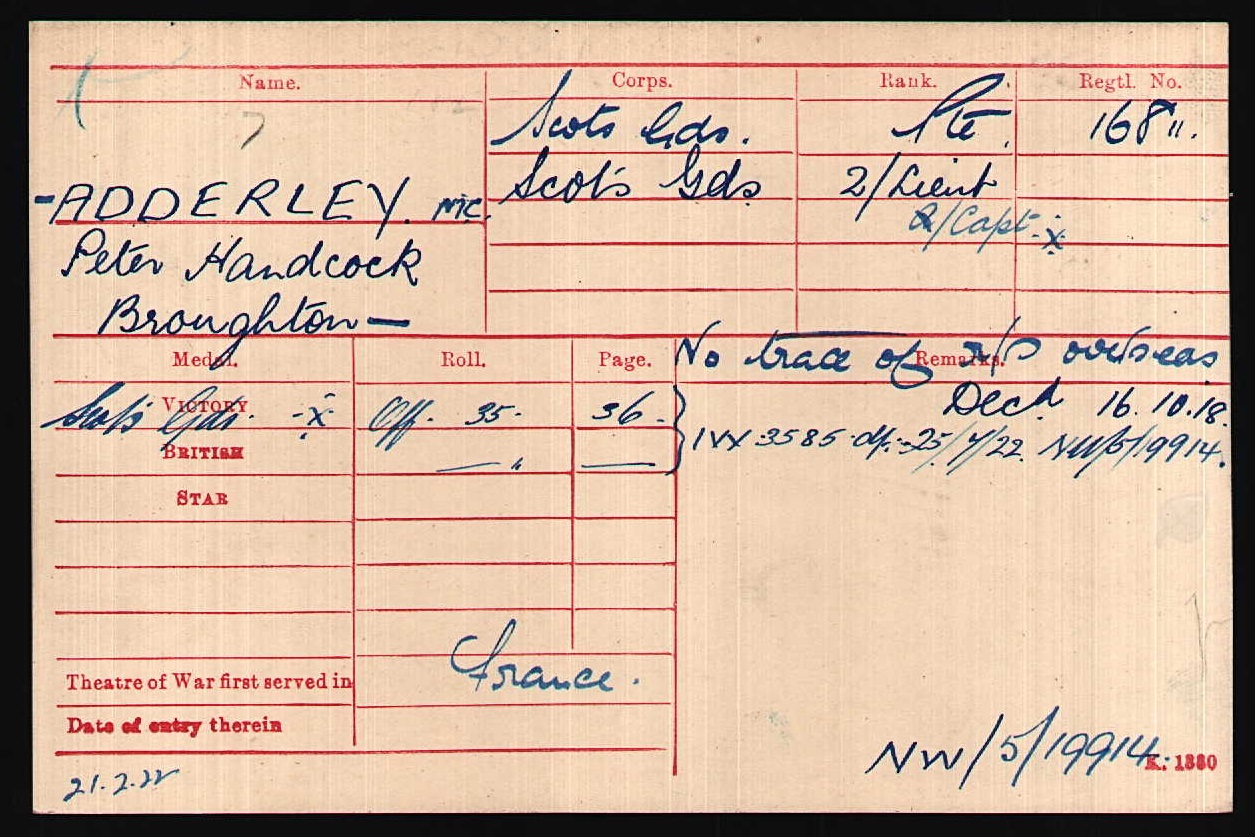 Eldest son of Hubert J. and the Hon. F. M. Broughton-Adderley, of Tunstall Hall, Market Drayton. ref. South African Roll of Honour 1914-1918. From Flight Global periodical 7 Nov 1918 - Capt. PETER HANDCOCK BROUGHTON-ADDERLEY, who died on October 16th of wounds received in action on the previous day, was the eldest son of Mr. and the Hon. Mrs. Hubert Broughton-Adderley, of Tunstall Hall, Maket Drayton, and Barlaston Hall, Staffordshire. He was educated at the Rev. E. L. Browne's, St. Andrew's, Eastbourne, Eton (Mr. Stones), and Exeter College, Oxford. He was a good allround sportsman and cricketer, and at Eton obtained his Upper Sexpenny, Lower Club, and XXII, and his house colours, and was a member of the Eton Society. At Oxford he played cricket for his college and for the Authentics, and was a member of the Bullingdon Club. He was also a member of the M.C.C. After leaving Oxford he went out to Rhodesia to take up tobacco farming, but after nine months contracted blackwater fever and sunstroke, and had to return to England. In 1914 he went to Canada, and on the outbreak of war tried to enlist, but could not get passed for active service. In September he joined the Royal North-West Mounted Police at Prince Albert, and served with that Force for two years. He then joined the R.N.A.S. at Toronto, and went to France in February, 1917, to complete his training, but owing to a bad crash had to give up flying. He transferred to the Scots Guards, went to the front with them in December, 1917, and obtained the acting rank of captain last September. |