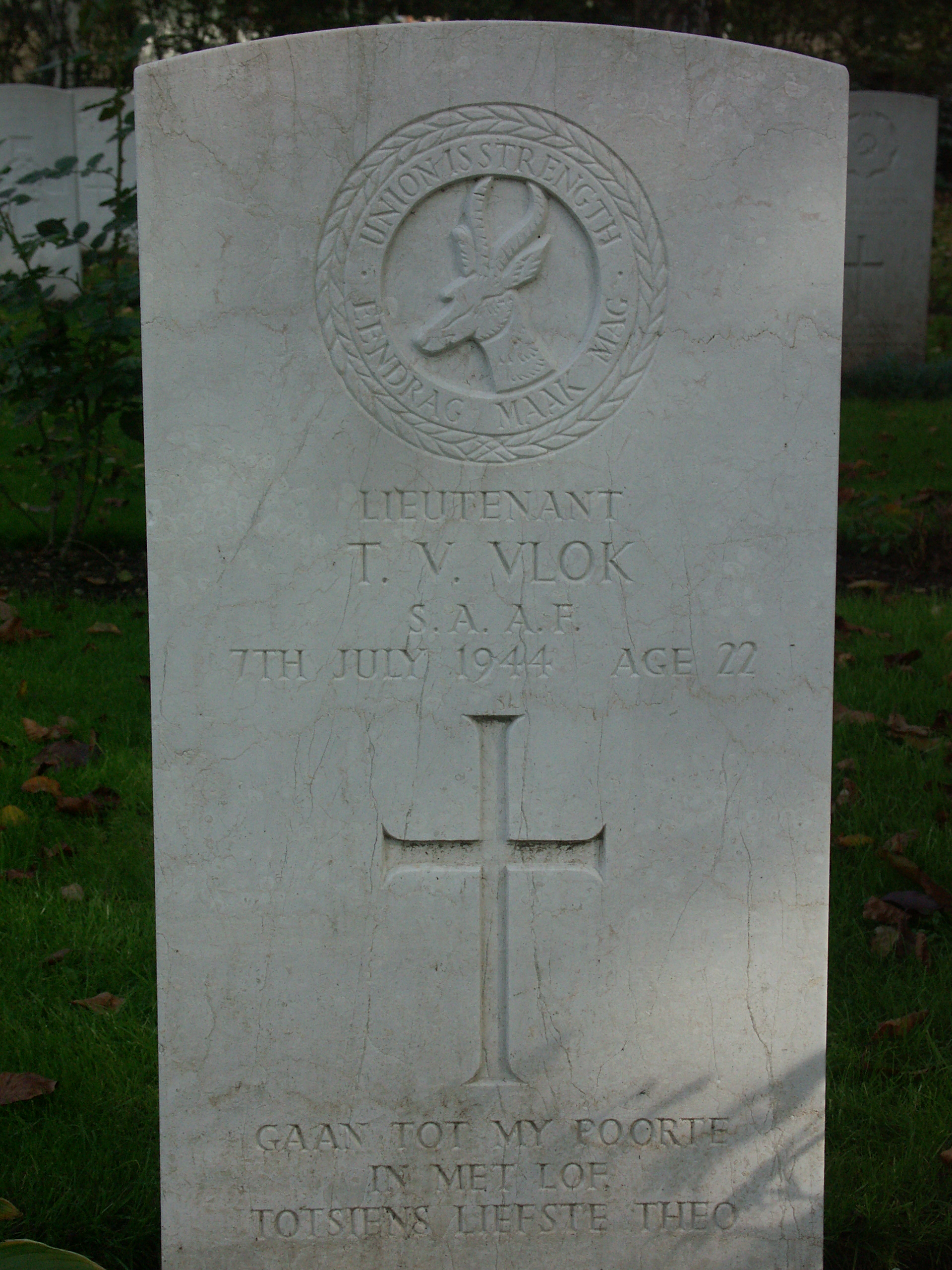 Son of Louis Adriaan and Ellen Vlok, of Piketberg, Cape Province, South Africa. |