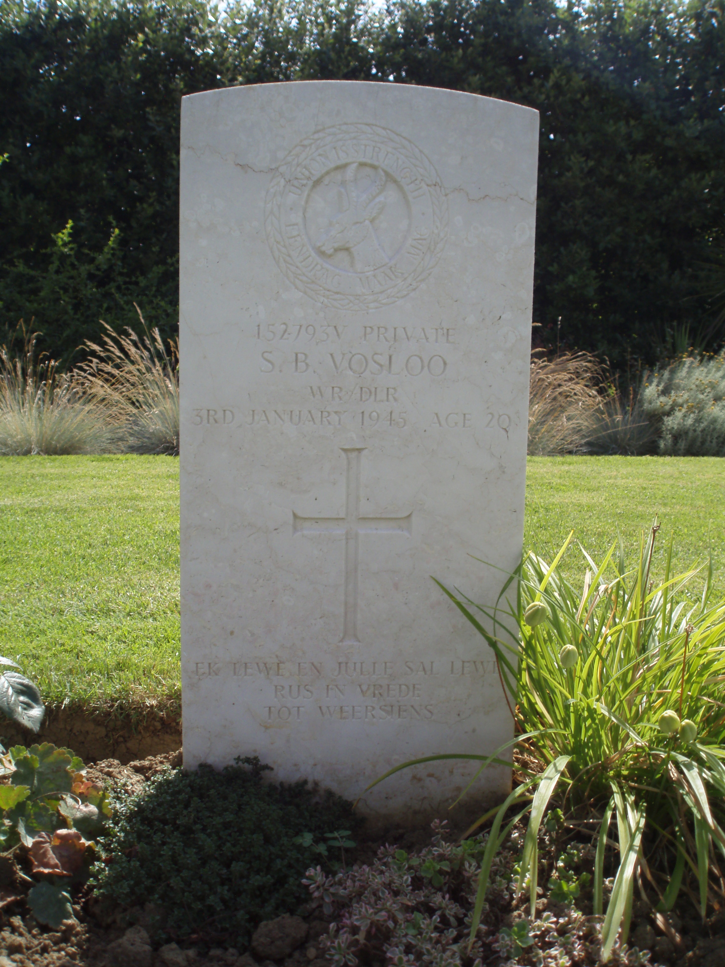 Son of Petrus Stephanus and Maria Aletta Magdalena Vosloo, of Matoppievlakte, Transvaal, South Africa. Born in Humansdorp. |