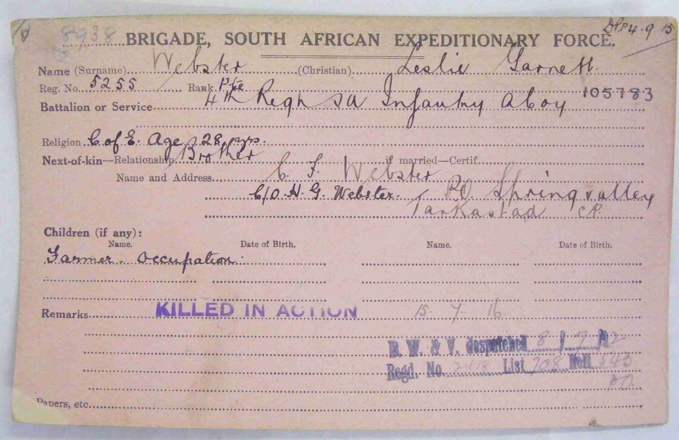 Son of Henry G. and Rosetta Webster, of Spring Valley, Tarkastad, Cape Province. A farmer. Commemoration plaque in Holy Trinity Anglican Church, Kokstad