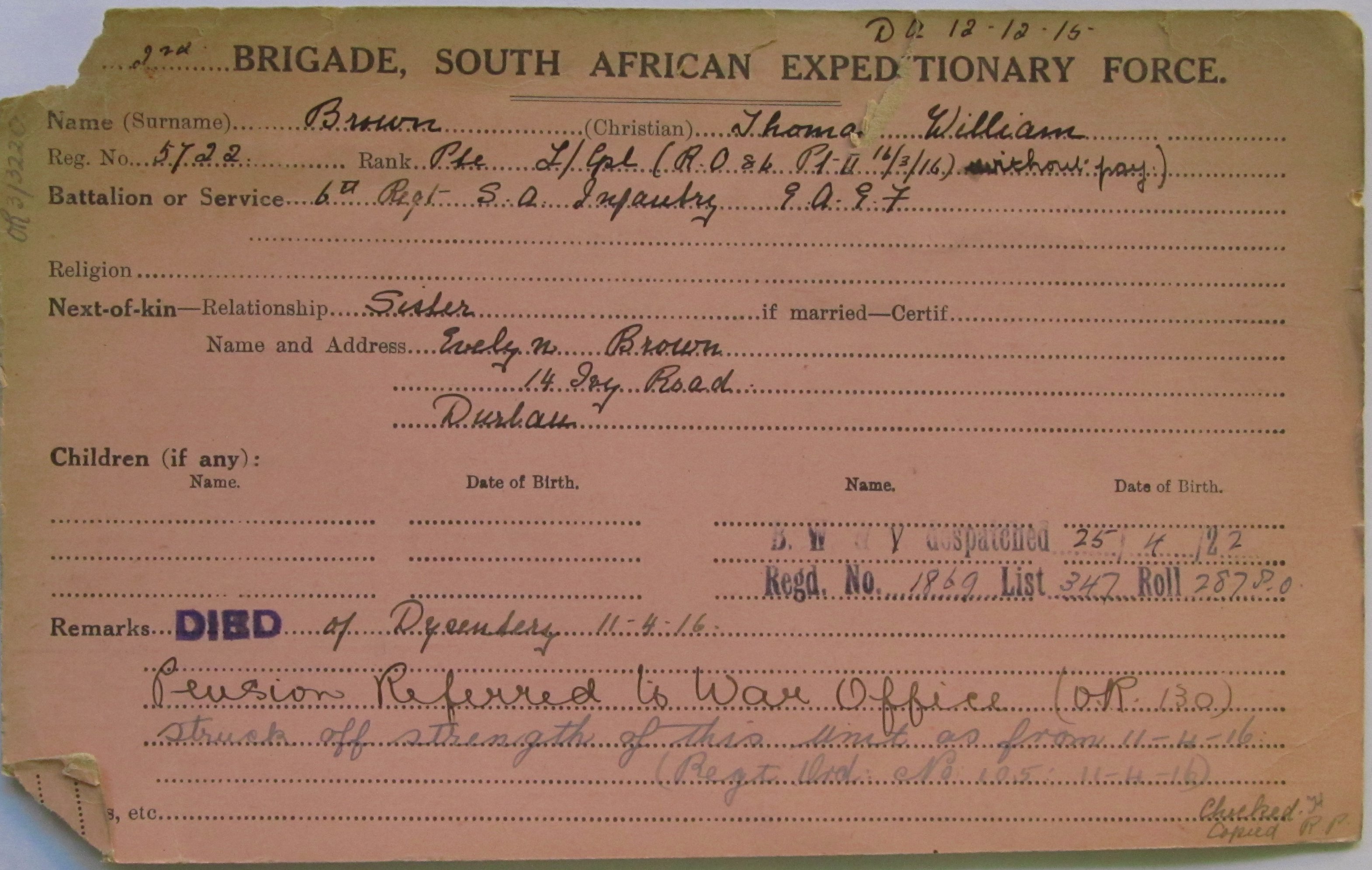 Son of Thomas and Isabella Brown. Born Durban.