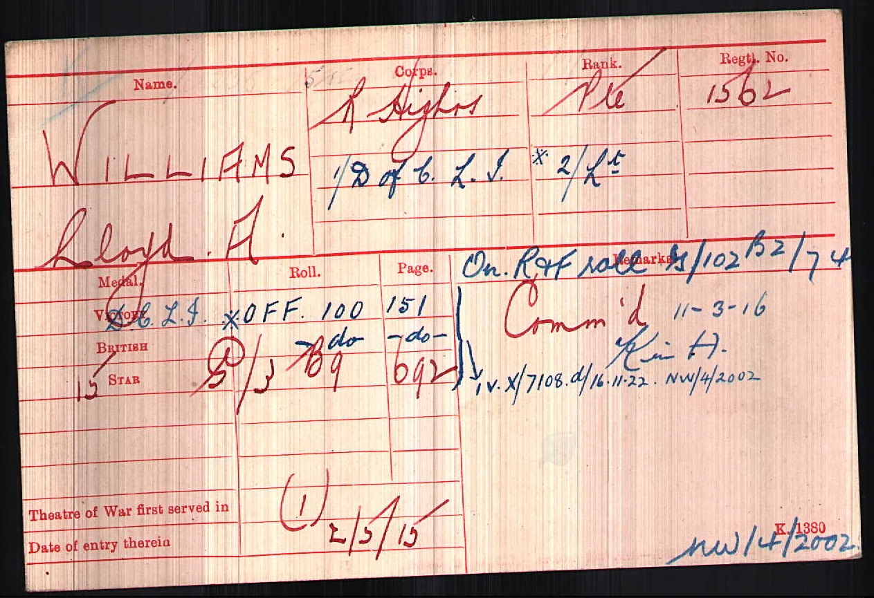 Son of the Rev. Ellis Jones Williams and Minnie Williams, of 20, Alexandra Rd., Market Drayton, Salop. Born in Natal, South Africa in 1893 and was educated at Kingswood School, Bath, England before entering the Civil Service. On outbreak of War in 1914, he enlisted in the Black Watch. In March 1915, he received his commission in the DCLI. ref. South African Roll of Honour 1914-1918.