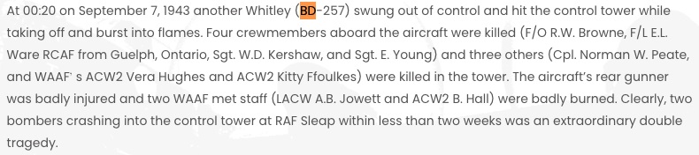 Died in Aircraft Accident, Armstrong Whitworth Whitley V BD257, went out of control and hit control tower at high speed before exploding, killing three ground staff and seriously injuring two others