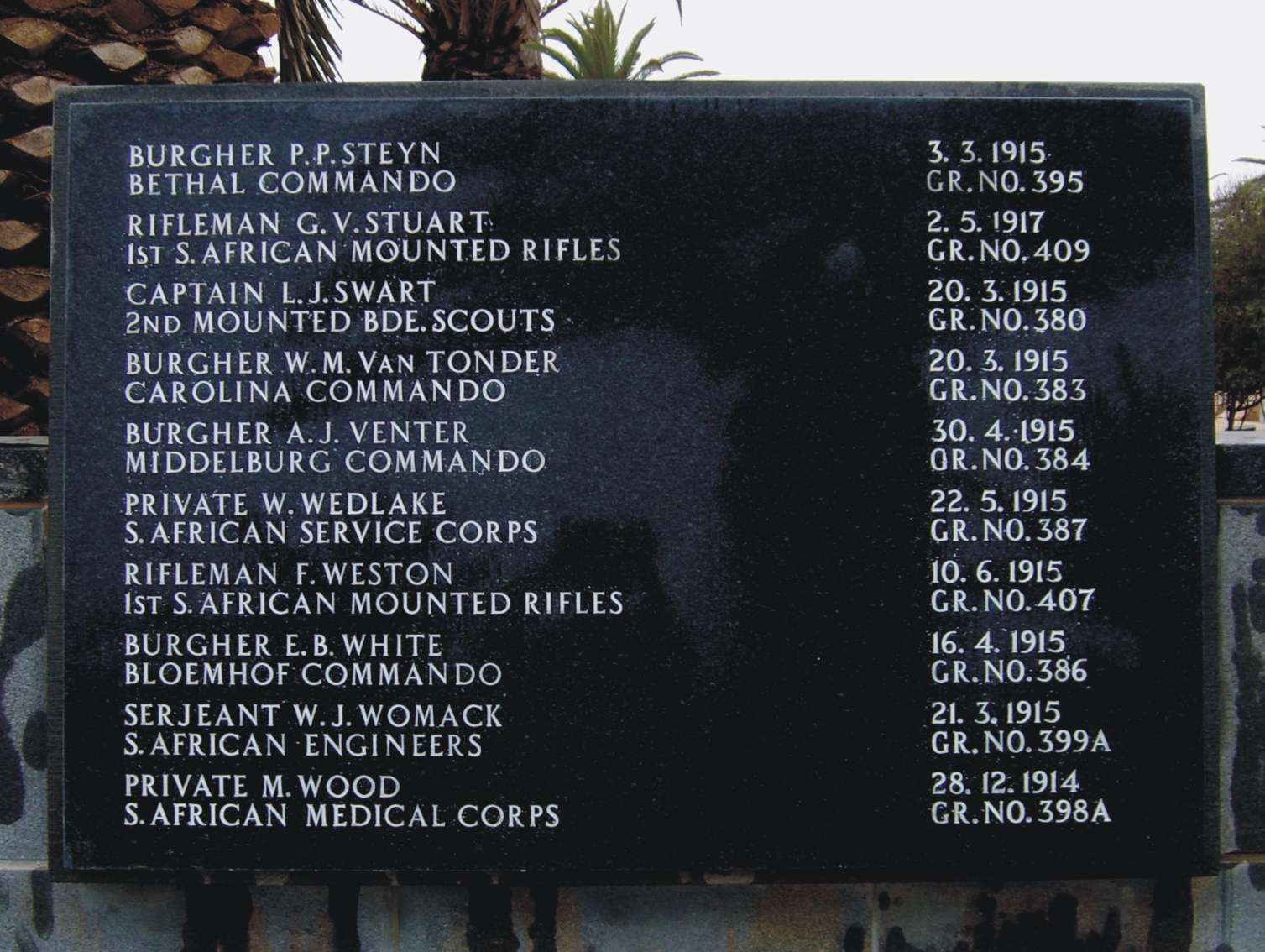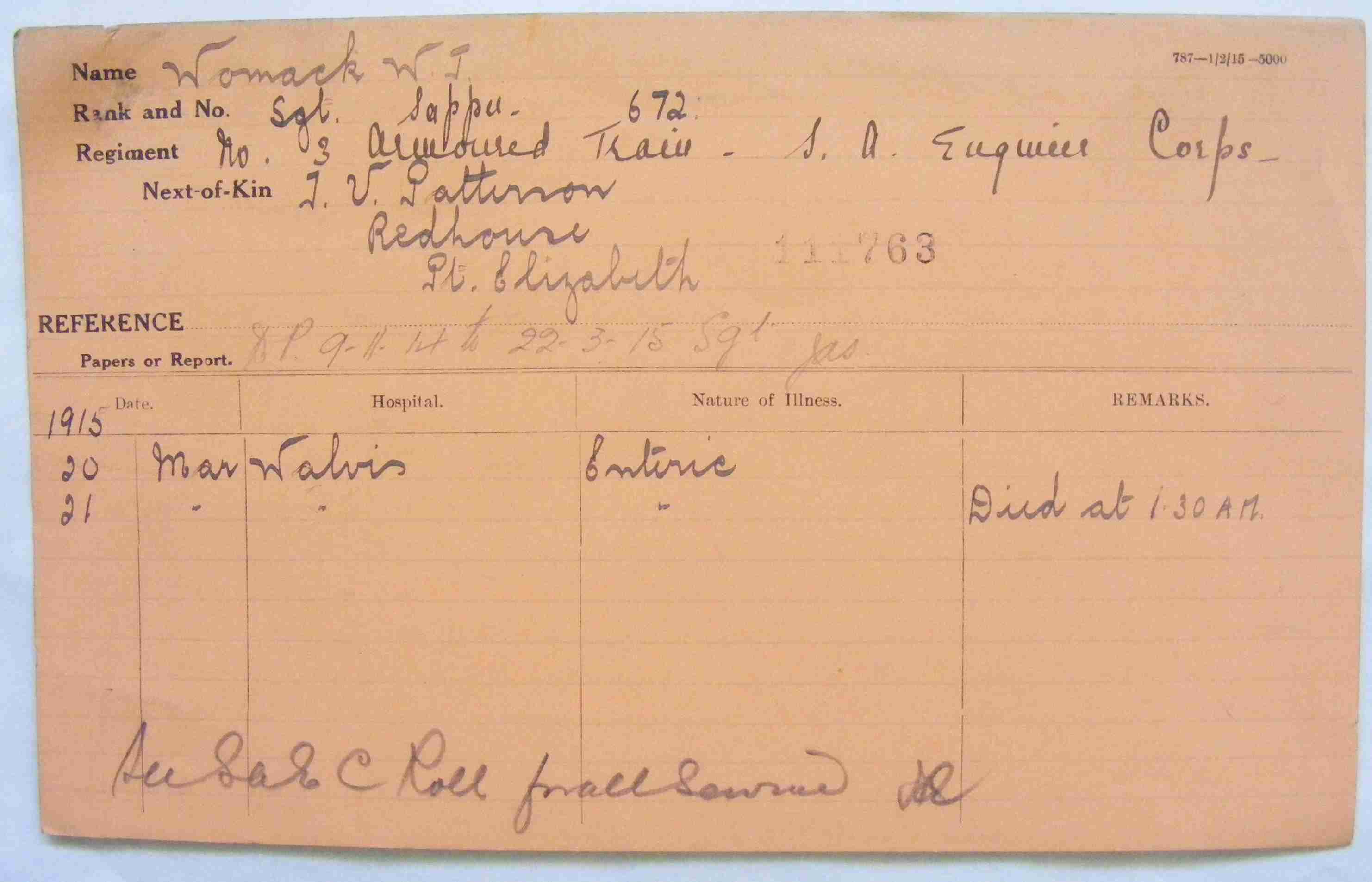 Son of William George and Fanny Womack. Next of kin, J. V. Patterson, of Redhouse, Port Elizabeth. Born Cardiff, Glamorgan, Wales