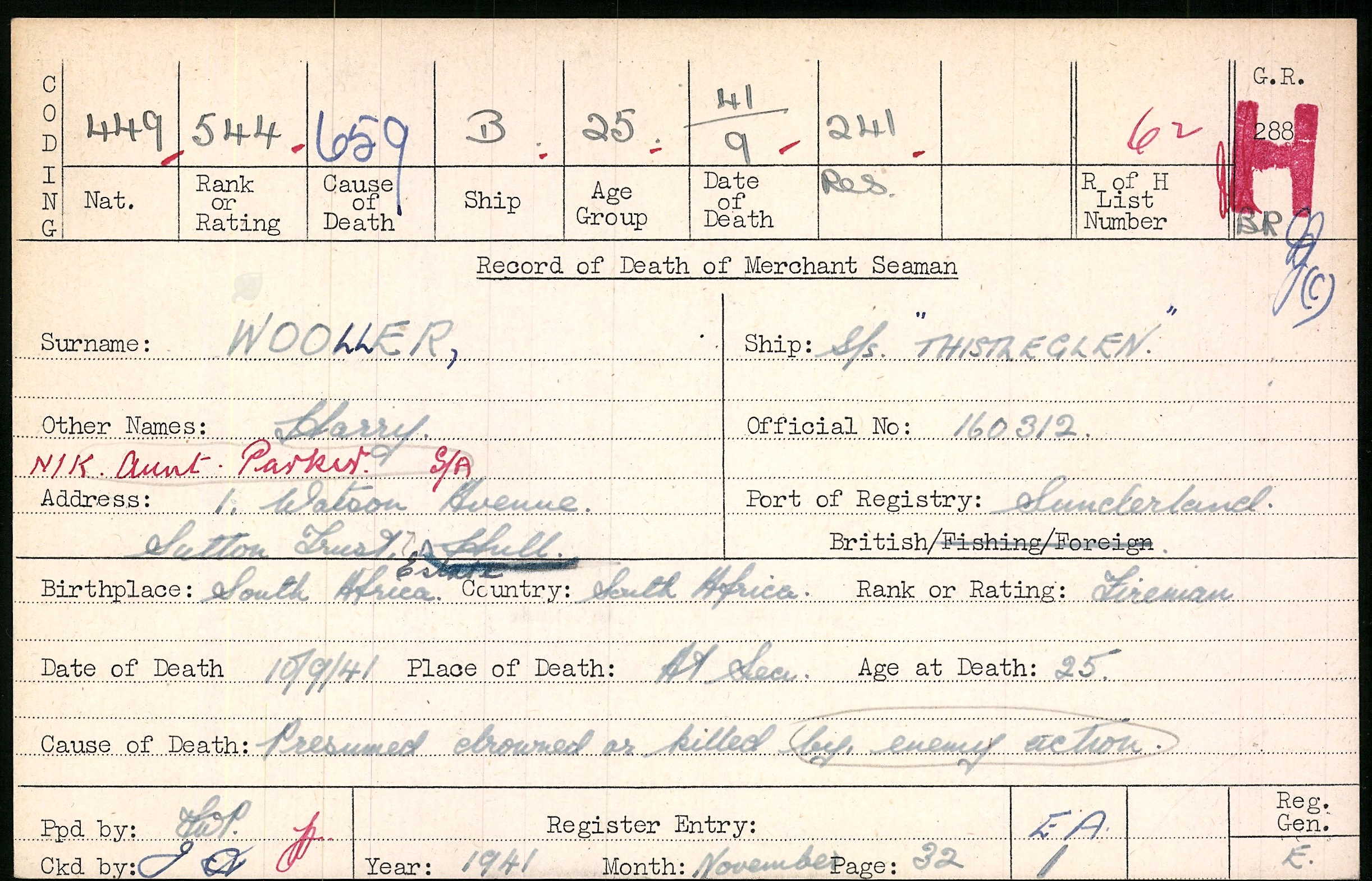 S.S. Thistleglen (Sunderland)Other Casualties from this Unit |