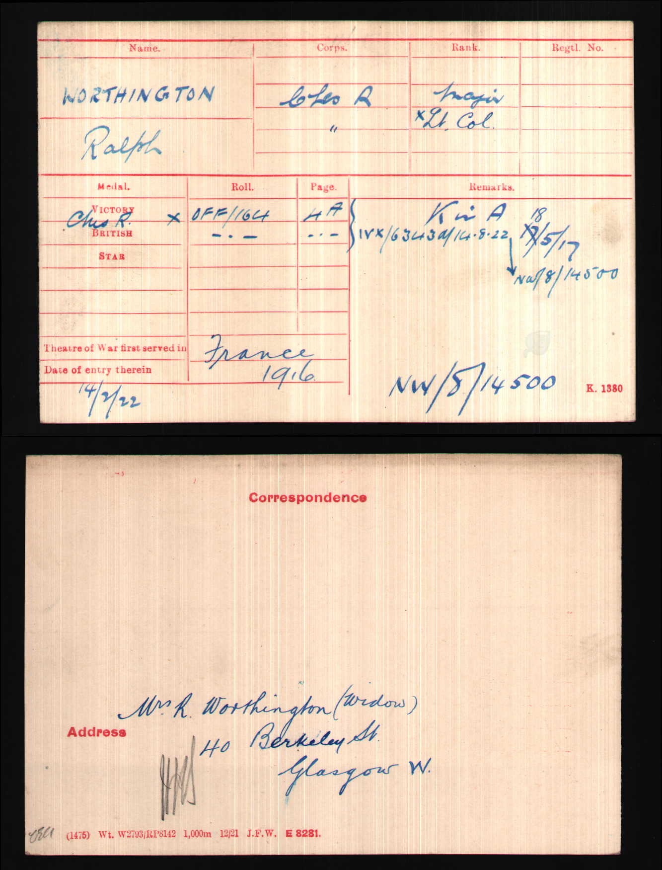 Son of Thomas Worthington, of Newcastle-on-Tyne; husband of Jenny Bruce Worthington, of 40, Berkeley St., Glasgow. ref. South African Roll of Honour 1914-1918