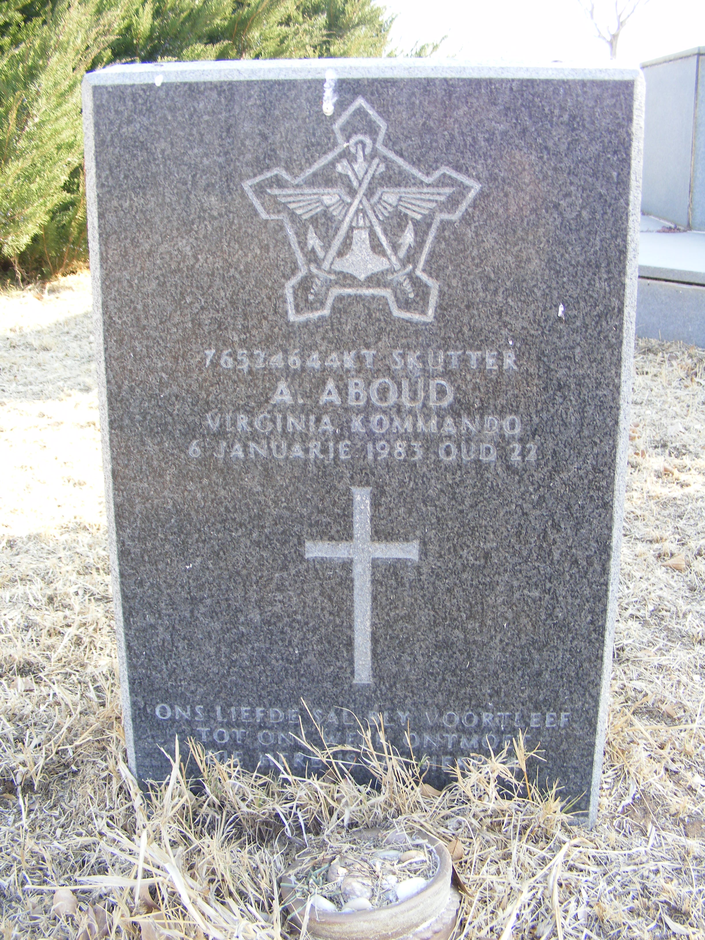 Killed in action. Buffel Troop Carrier detonated a boosted anti-tank mine near the Okangwati Military Base, while on route to Sodeliet base. One of the mines used was an old British Mk 8 Anti-Tank Mine and the metal plug on top of this mine penetrated the V hull of the Buffel on the welded seam. This ignited the diesel tank and a box of white phosphorus grenades in the vehicle. |