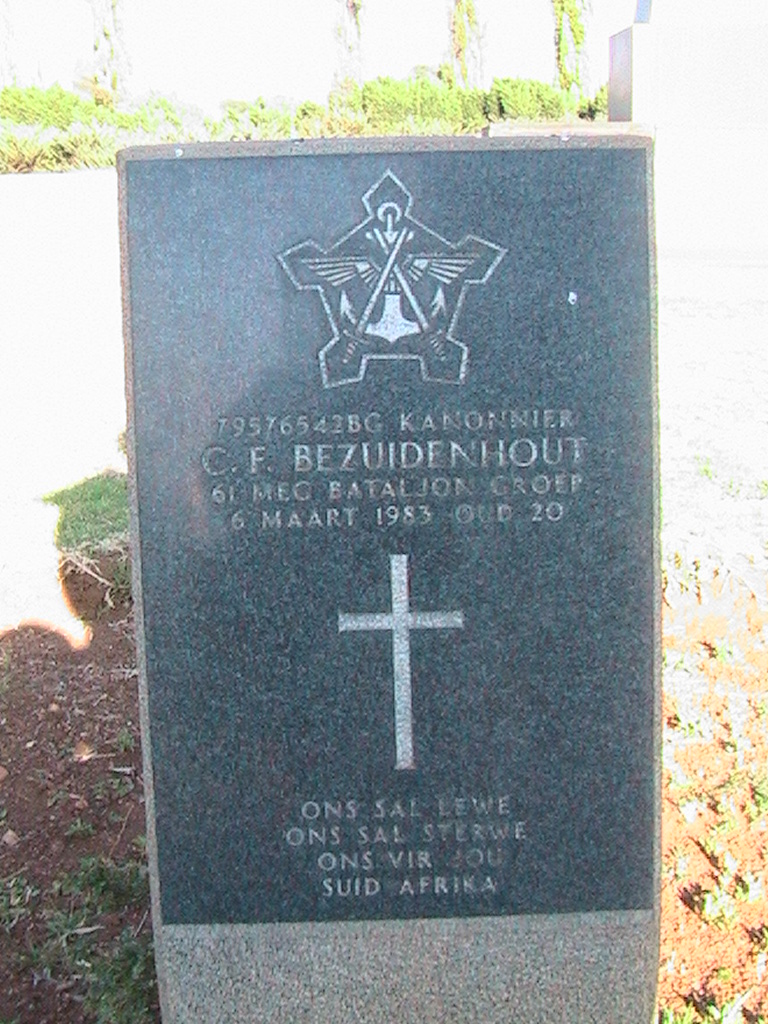 Killed in action, on guard duty with Gnr. J. Bosse on a farm near Tsumeb, well below the danger line. A small band of terrorists sneaked up on the two and shot them at point blank range. |