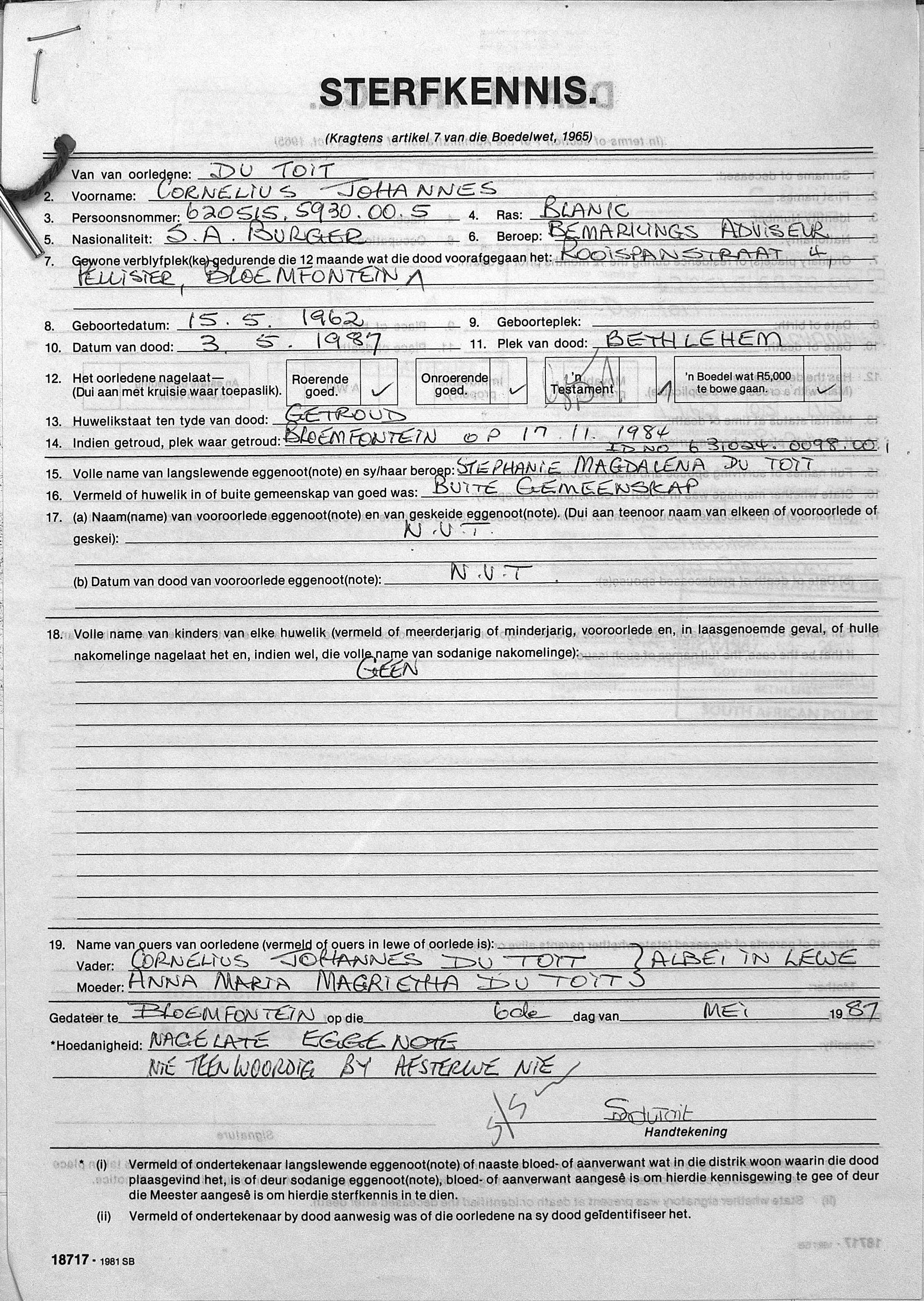 Son of Cornelius Johannes and Anna Maria Magrietta du Toit. Husband of Mrs. Stephanie Magdalena du Toit |
