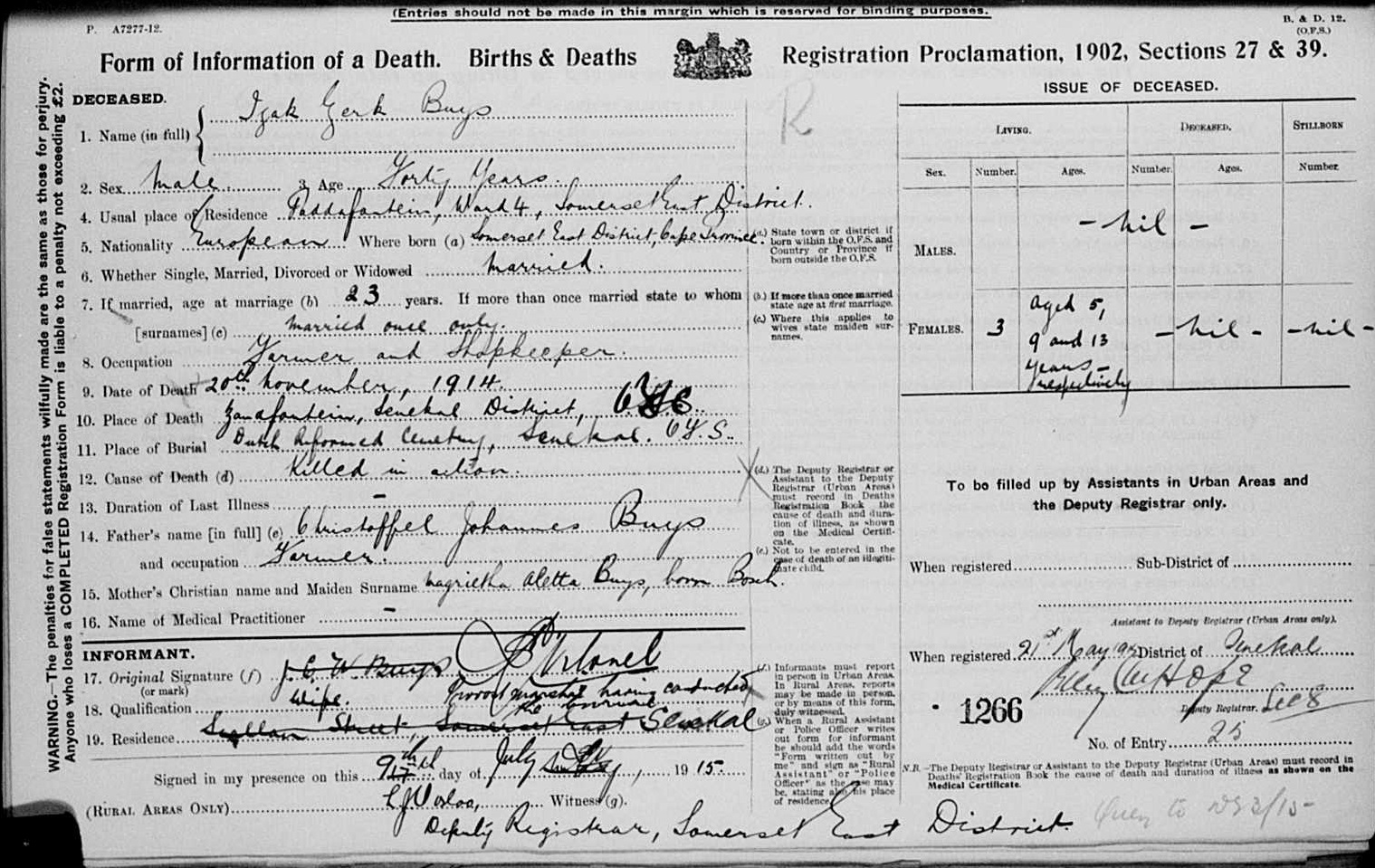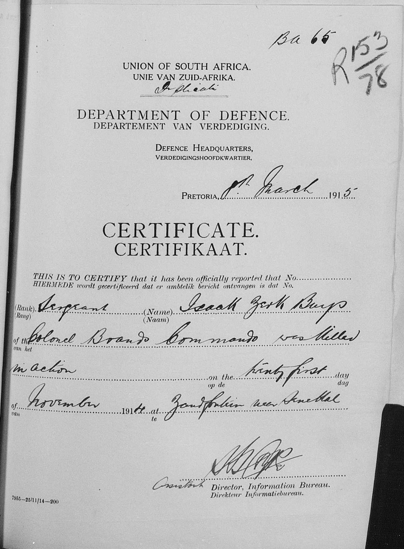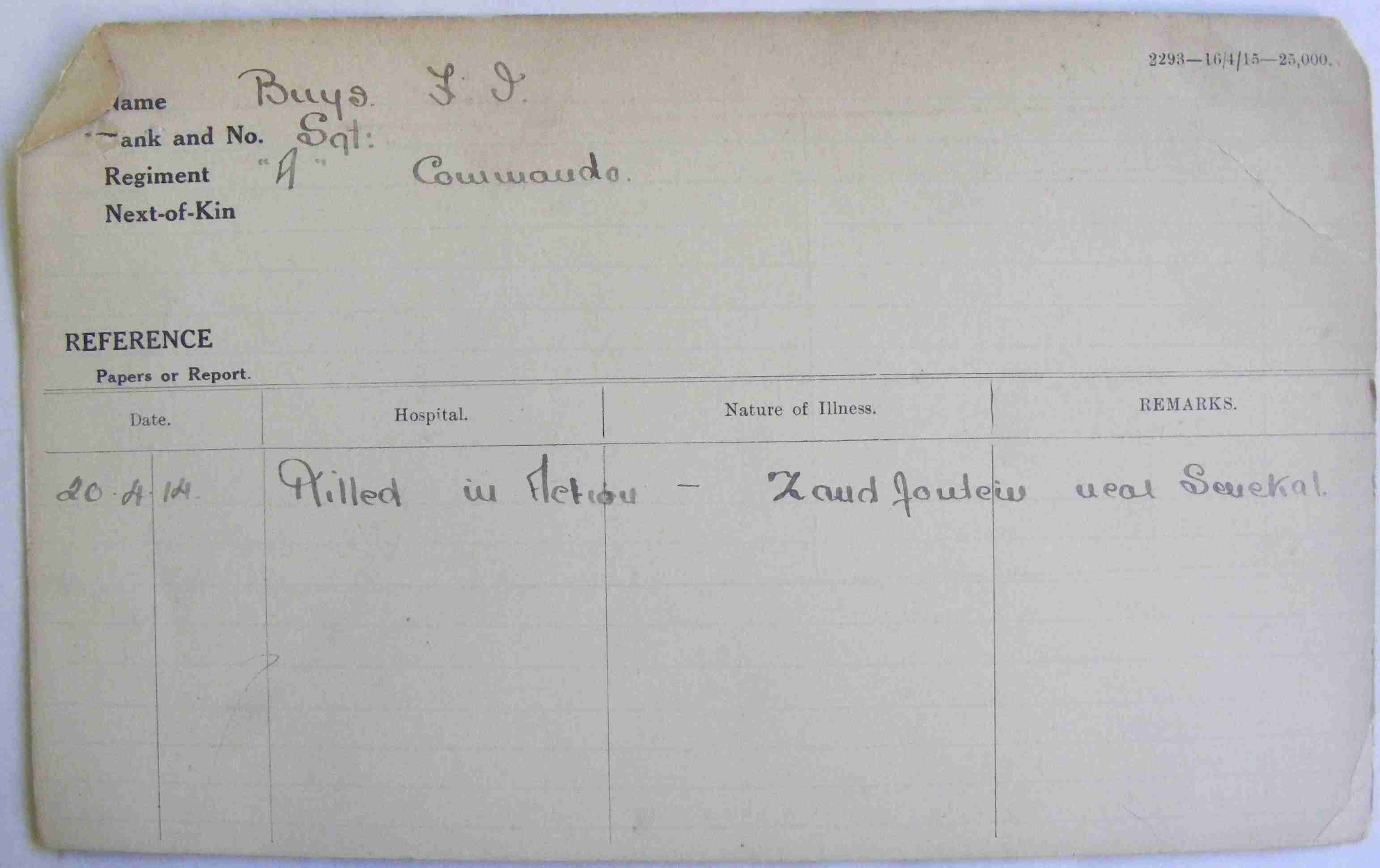 Son of Christoffel Johannes and Magrietha Aletta (nee Bosch) Buys. Husband of Johanna Catharina Wilhelmina Buys. ***CWGC has J Z on headstone, needs to be amended |