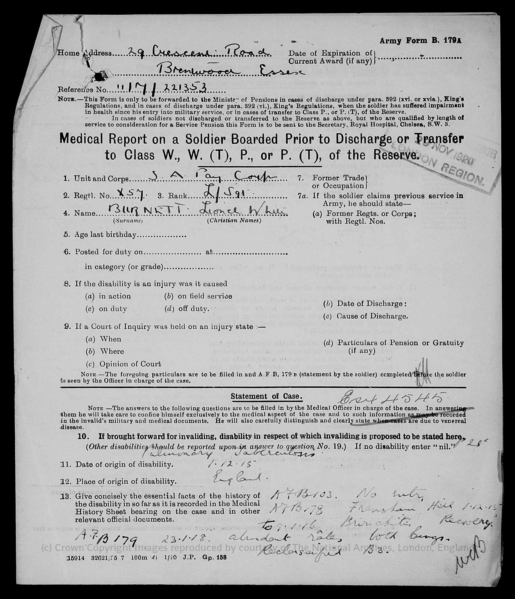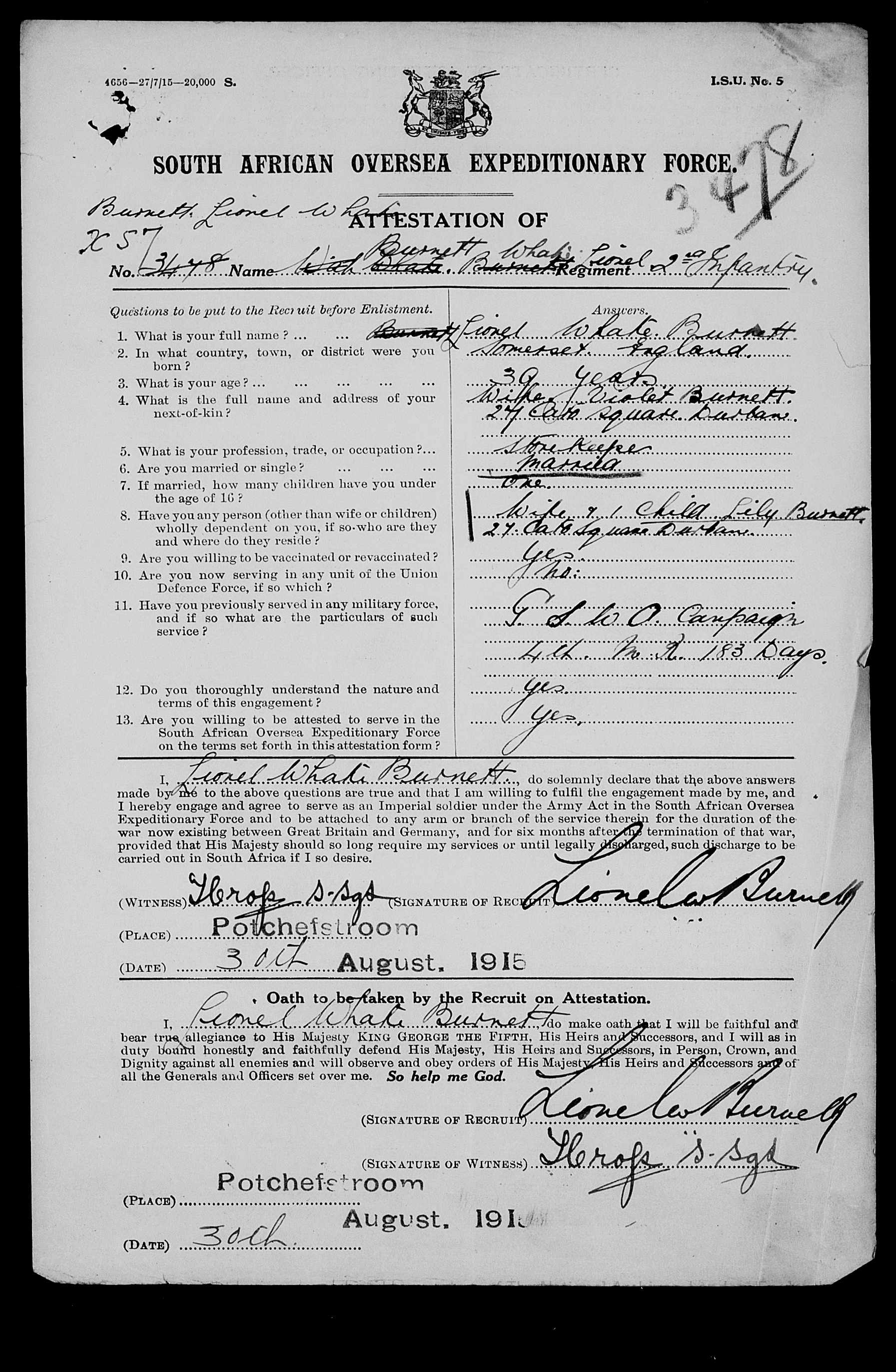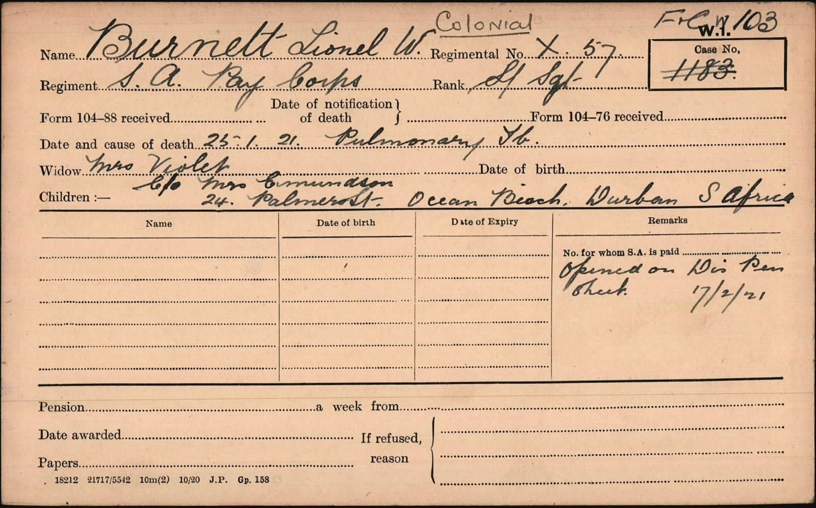 Son of James Davis and Emma Burnett. Husband of Violet Burnett, of Ocean Beach, Durban. Previously served with 4th Mounted Rifles in German South West Africa campaign. |