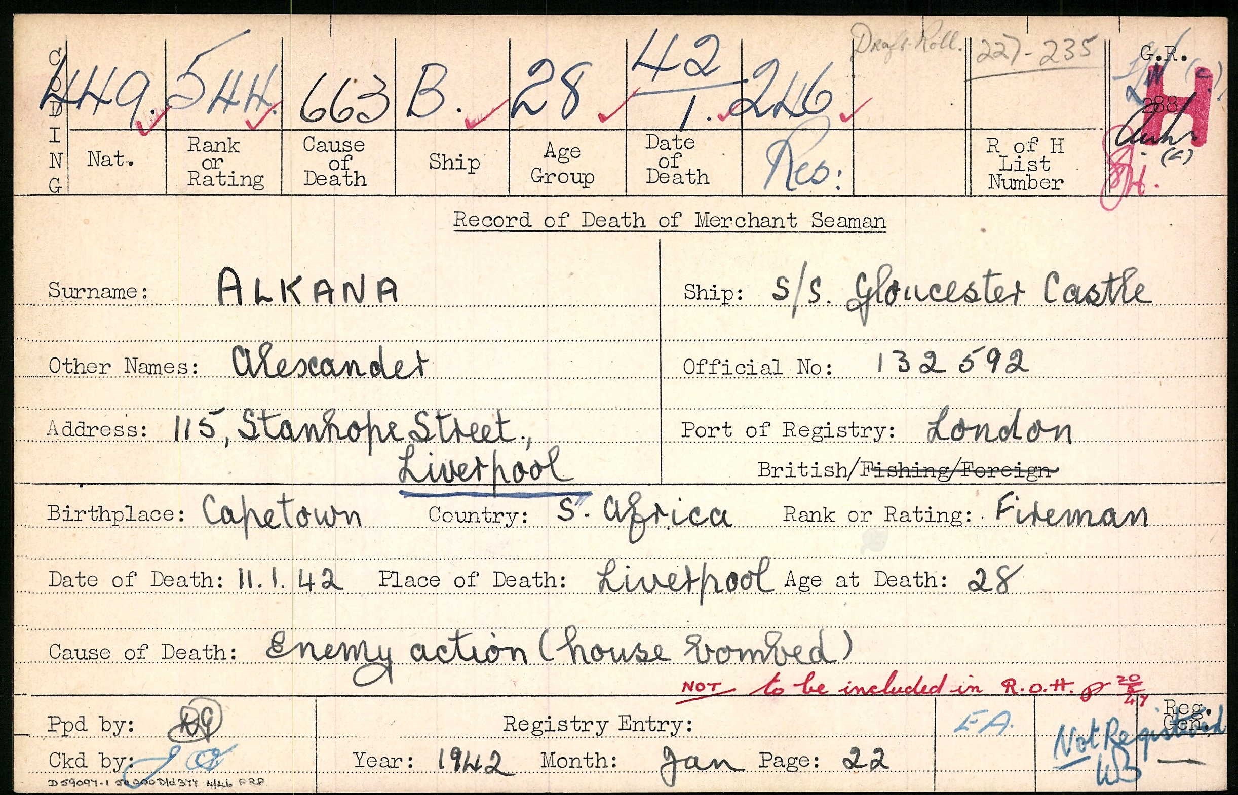 Born Cape Town, South Africa. Of 33 Great George Square, at Smithdown Road Hospital. ref. South African Roll of Honour 1939-1945. His last place of abode was listed as 115 Stanhope St., Liverpool |