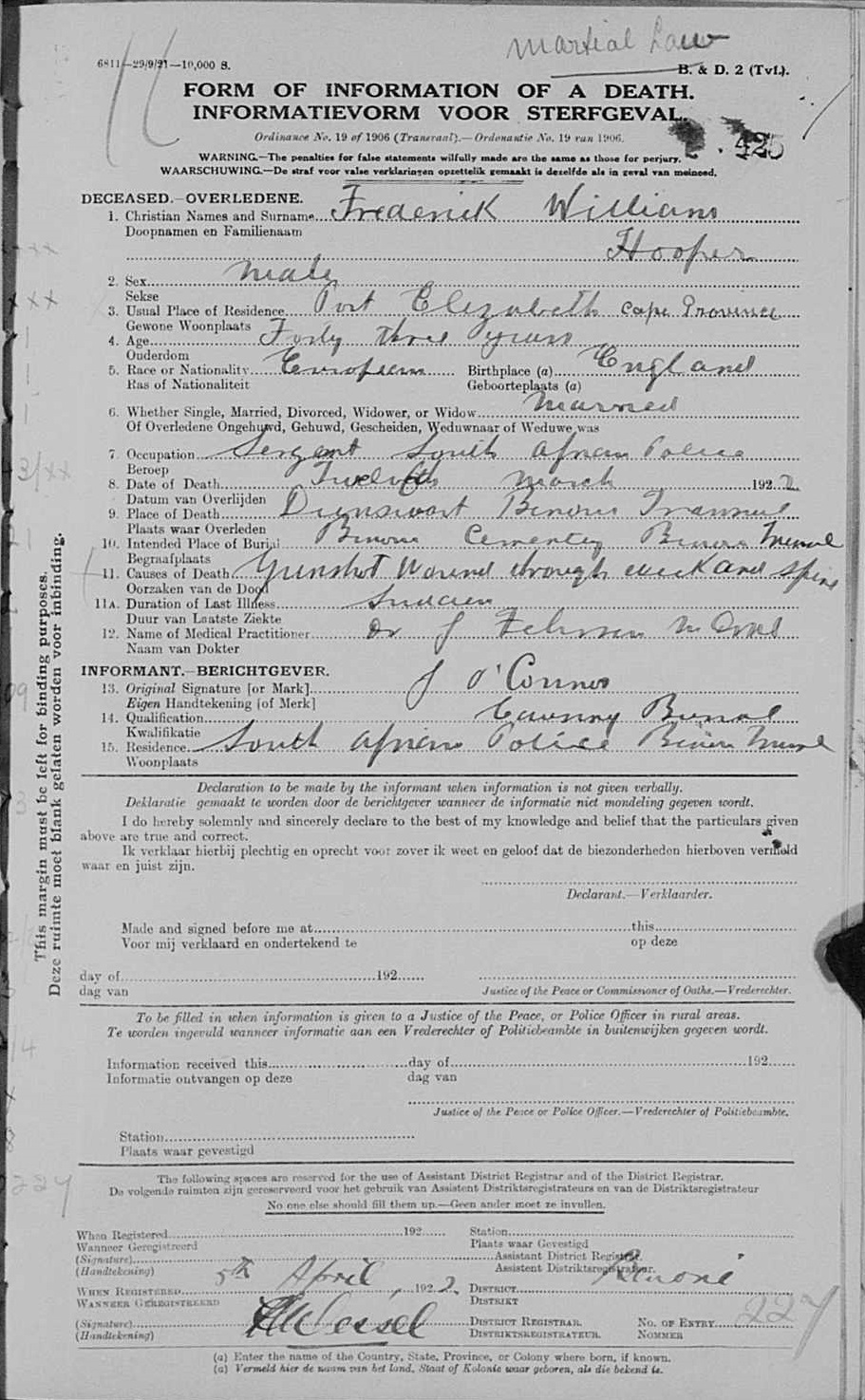 Killed in action, gun shot wound neck and spine, during Rand Revolt