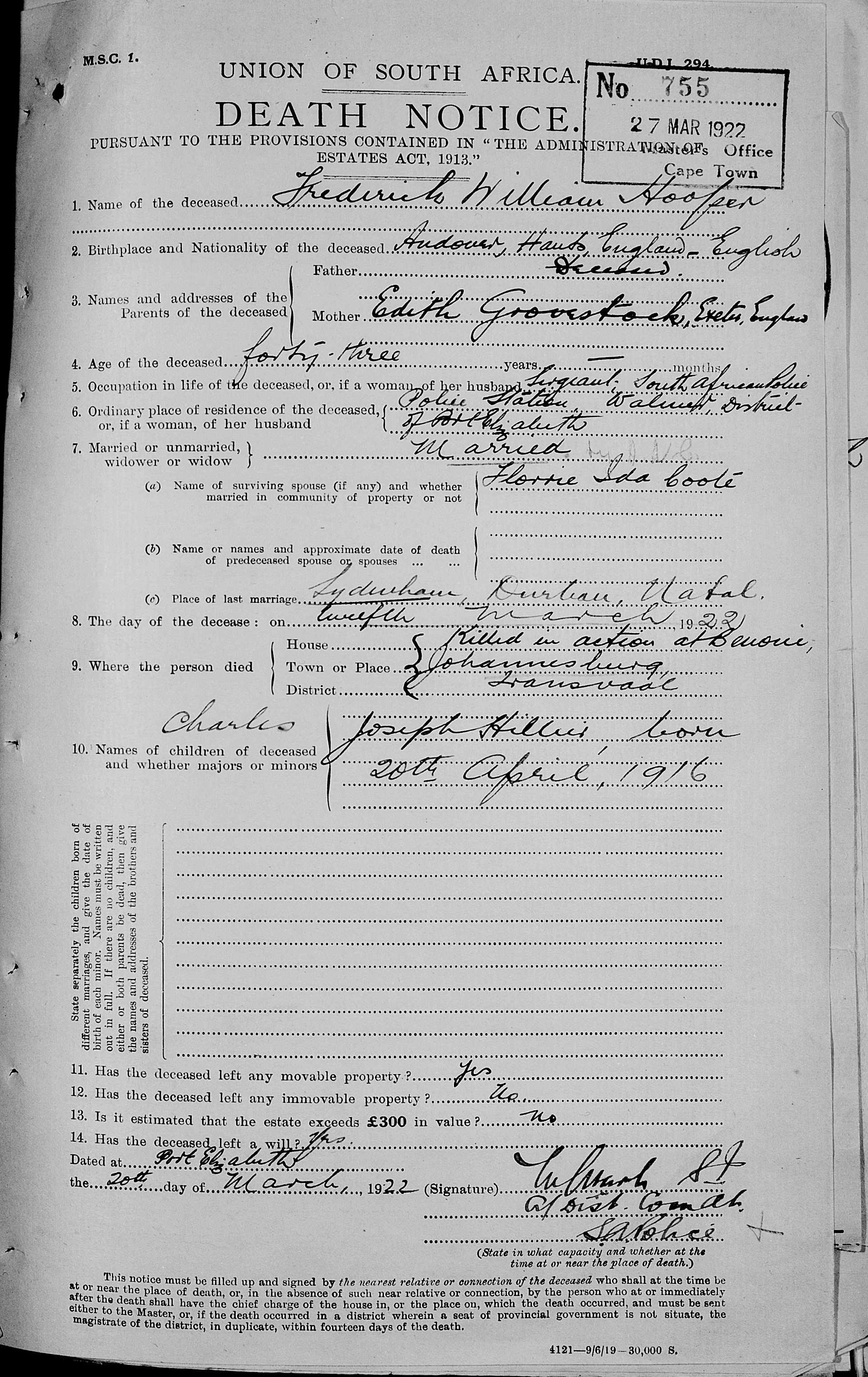 Son of Edith Grovestock, of Exeter, England. Husband of Florie Ida Cooper, of Walmer, Port Elizabeth. Born Andover, Hants, England.