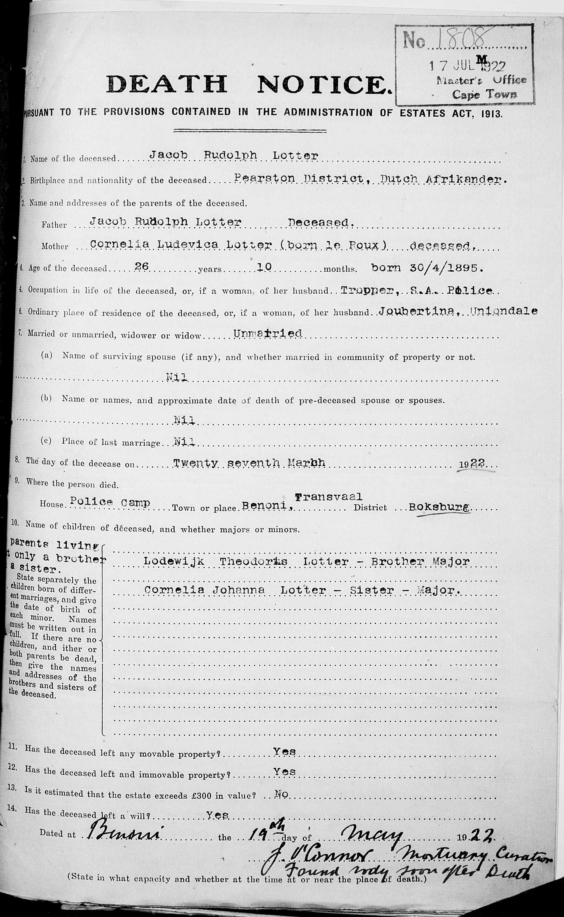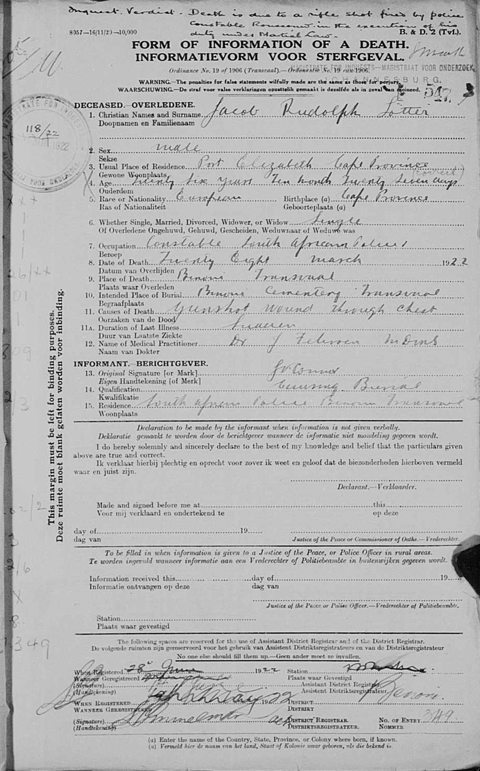 Son of Jacob Rudolph and Cornelia Ludevica Lotter. Born Pearston District. |