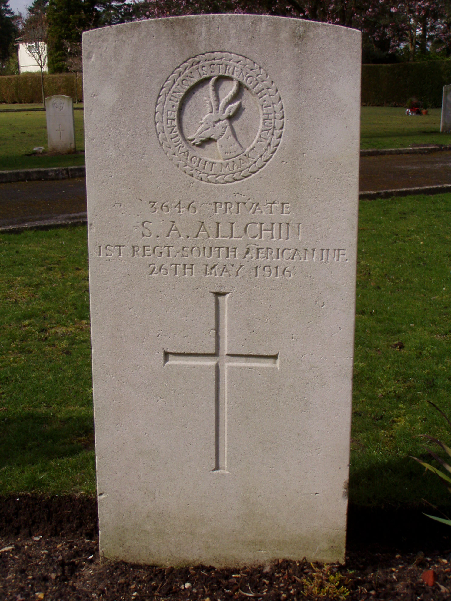 Son of James and Bertha Allchin. Brother of William H. Allchin, of 3 Sea View Villa, Sea Point, Cape Province. Born Cape Town. |