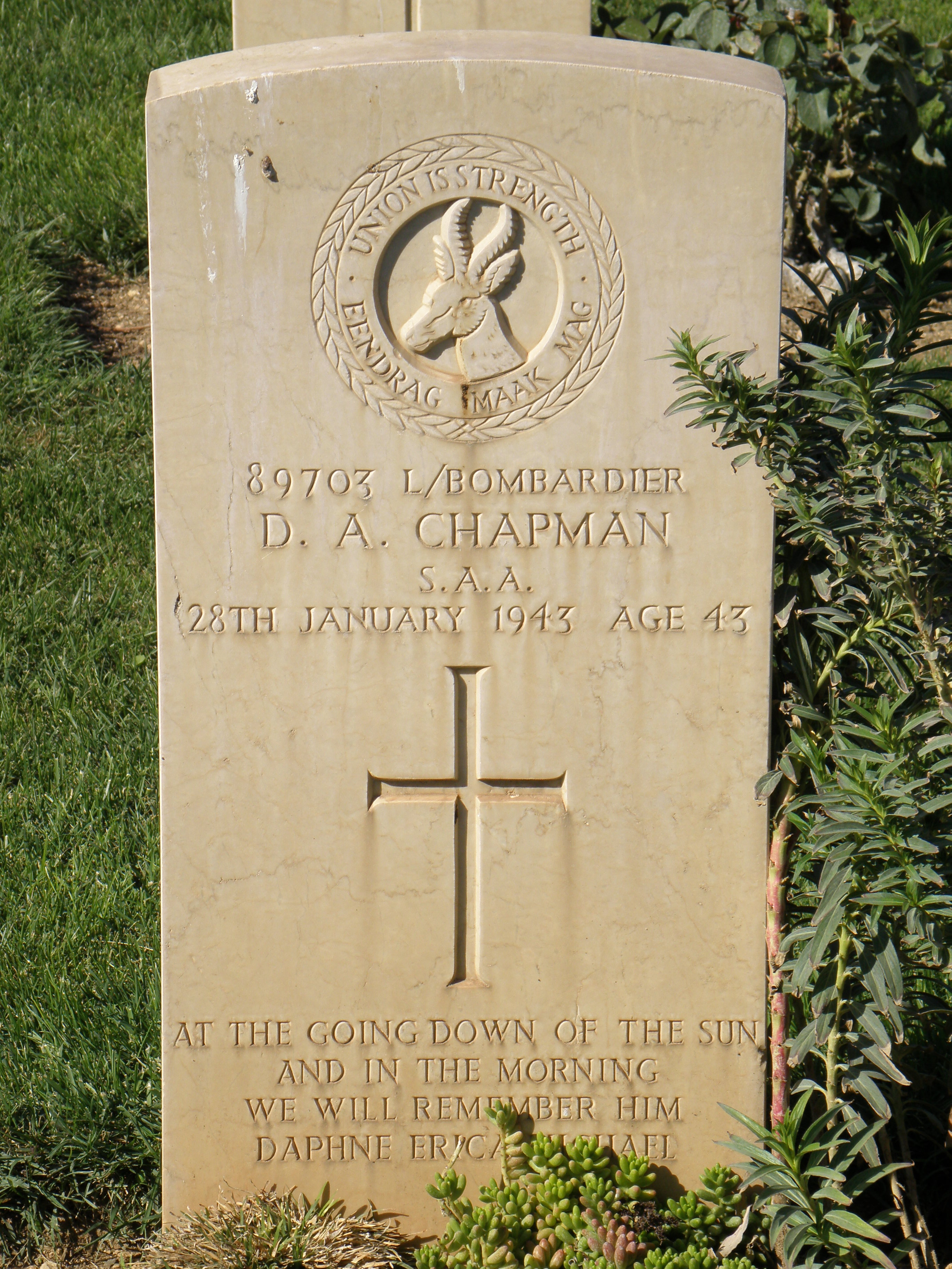 Son of William James and Sarah Annie Chapman, of 129 Lambert Road, Durban. Husband of Daphne Barbara Chapman (nee Von Gerard), of 40 Ridge Road, Scottsville, Pietermaritzburg. Born Durban. A solicitor and notary public. He had a son and a daughter. Commemoration stone in Durban (West Street) Cemetery
