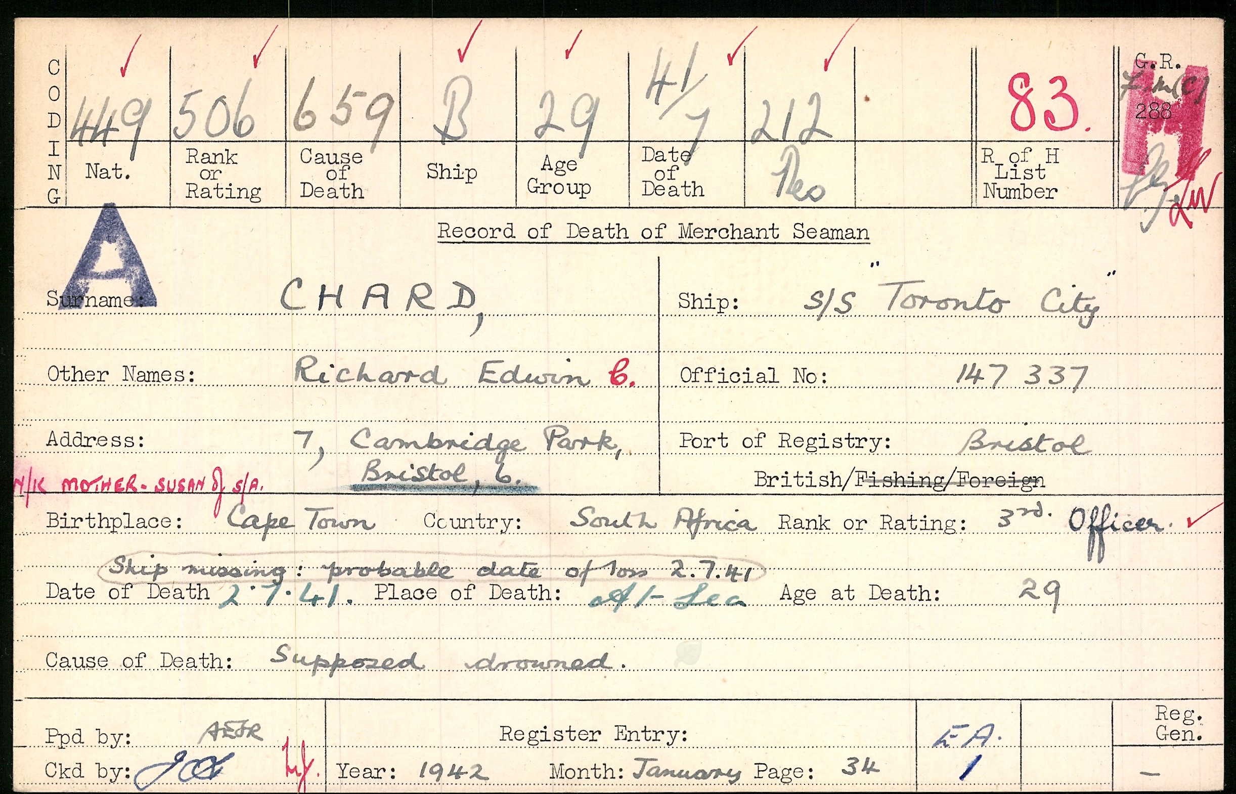 Son of Edwin Herbert and Susan Martha Chard. Born in 1912. ref. South African Roll of Honour 1939-45. |