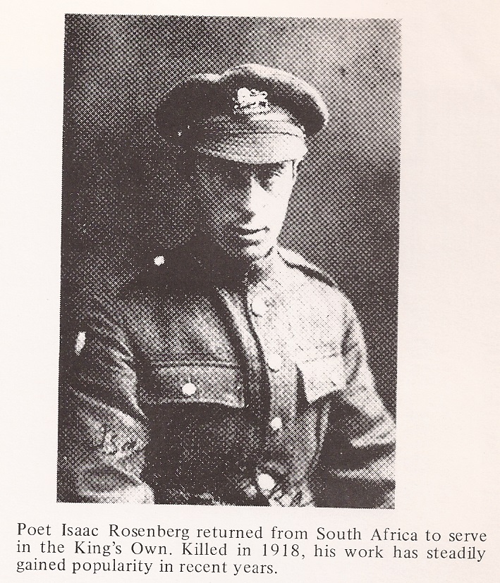 He wrote the poem "On Receiving News of the War" in Cape Town, South Africa. While others wrote about war as patriotic sacrifice, Rosenberg was critical of the war from its onset. However, needing employment in order to help support his mother, Rosenberg returned to England in October 1915 and enlisted in the army. He was assigned to the 12th Suffolk Regiment, a "bantam" battalion (men under 5'3"). After turning down an offer to become a lance corporal, Private Rosenberg was later transferred to the 11th Battalion, The King's Own Royal Lancaster Regiment (KORL). He was sent to the Somme on the Western Front in France where, having just finished night patrol, he was killed at dawn on April 1, 1918; there is a dispute as to whether his death occurred at the hands of a sniper or in close combat. ***Jewish |