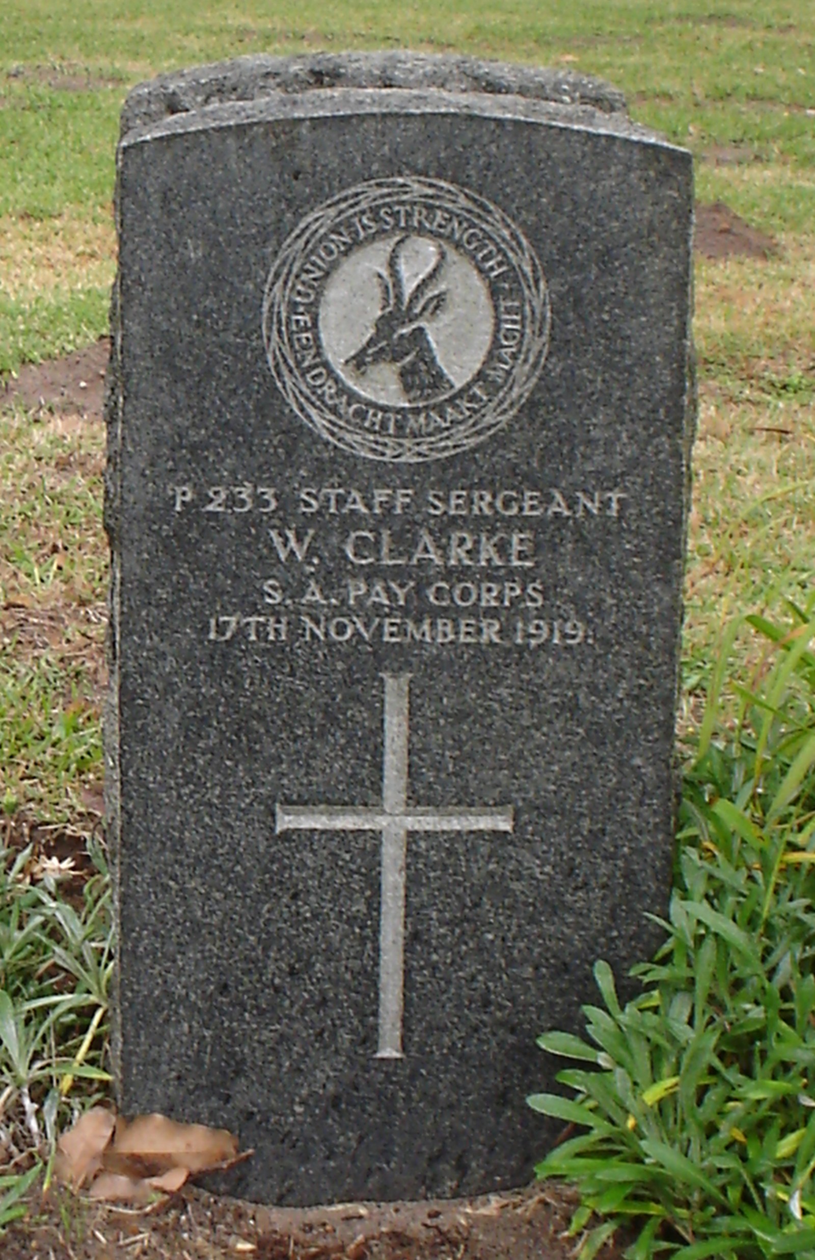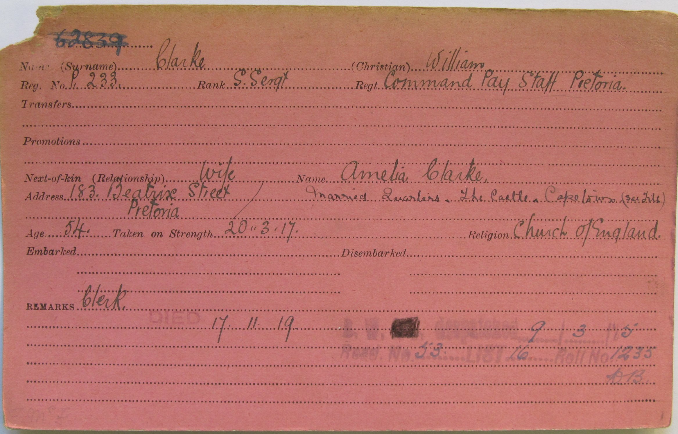 Husband of Amelia Clarke, of 183 Beatrix Street, Pretoria. Born England. A clerk.
