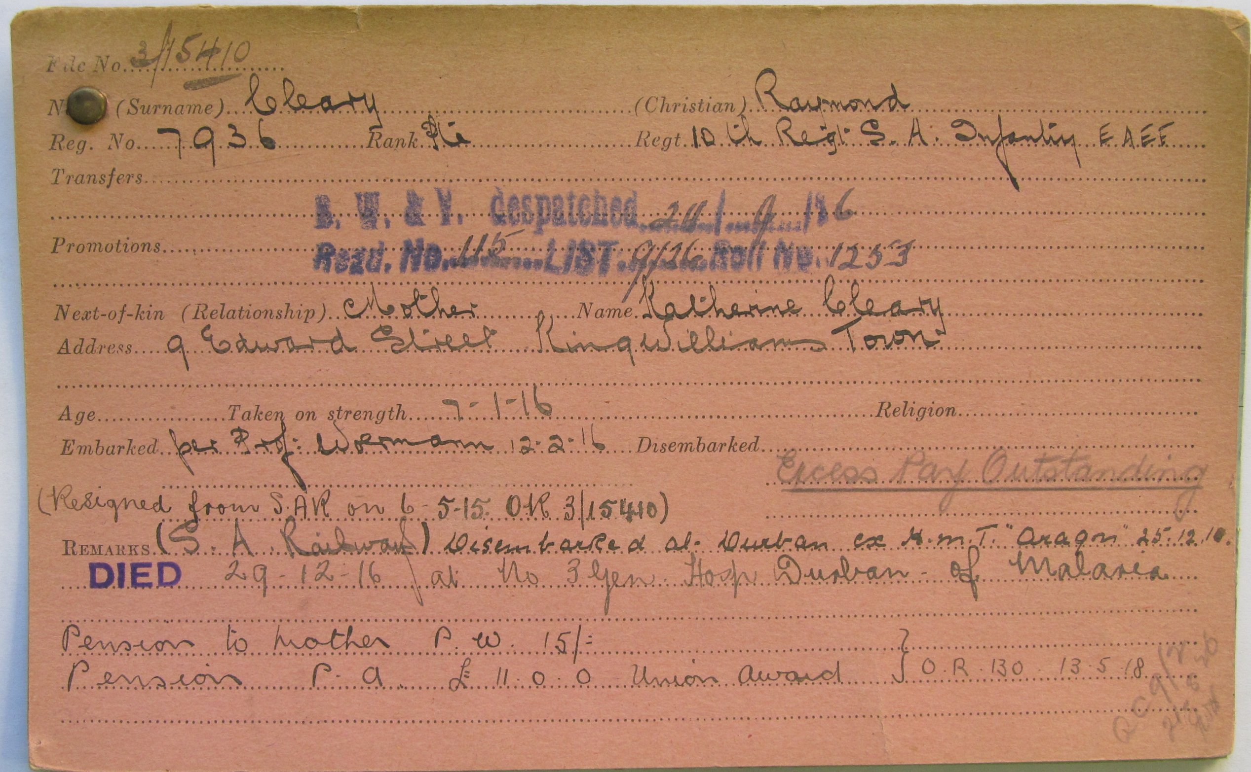 Son of Patrick John and Catherine Cleary, of 9, Edward St., King William's Town, Cape Province.