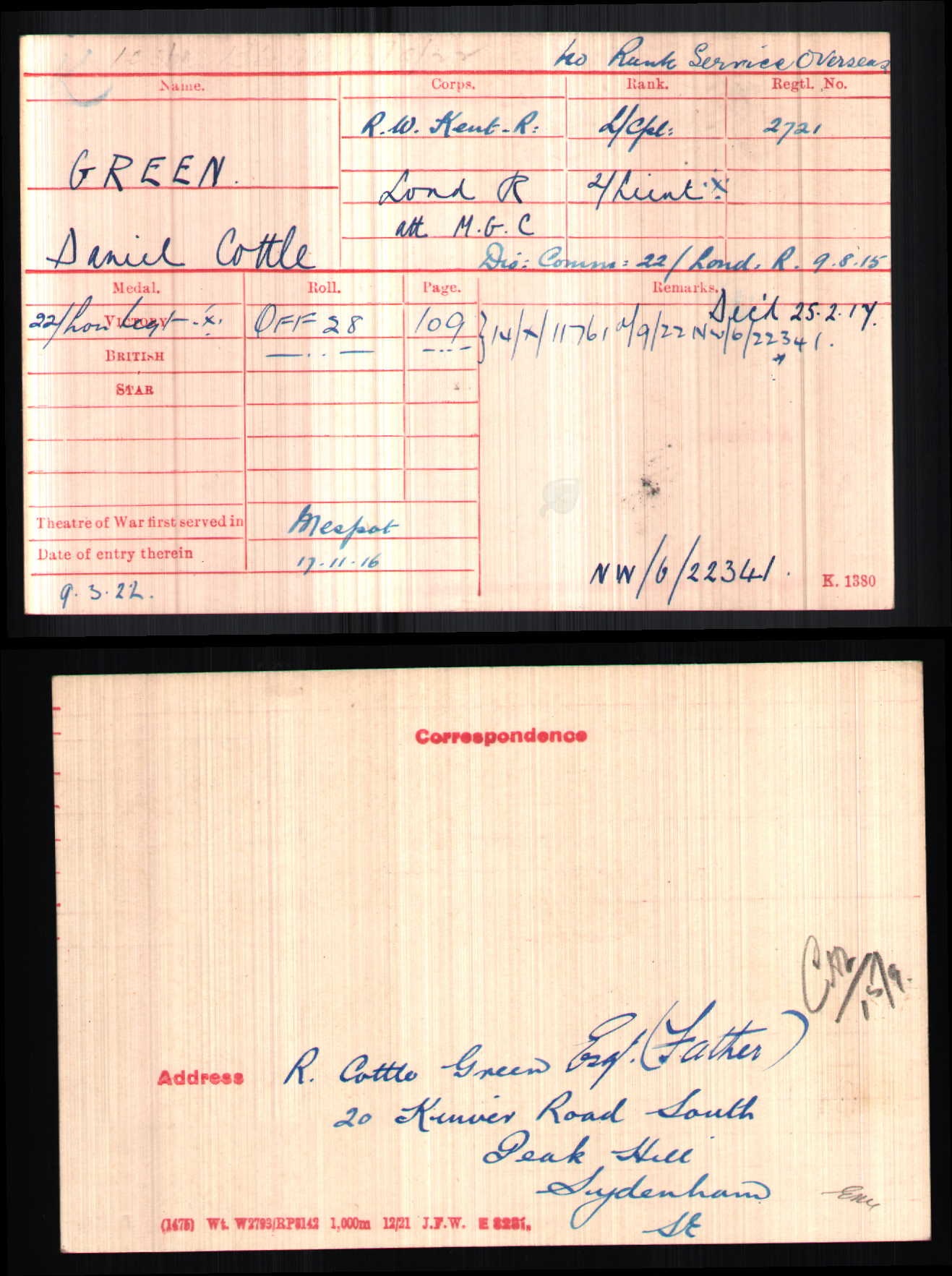 Son of Robert Cottle-Green, of 20 Kinver Road, Sydenham, ex-chairman of the Pretoria Club, South Africa. Born Pretoria, South Africa. His brother Robert Cottle-Green also died in service. He is commemorated on his brother's headstone in France.