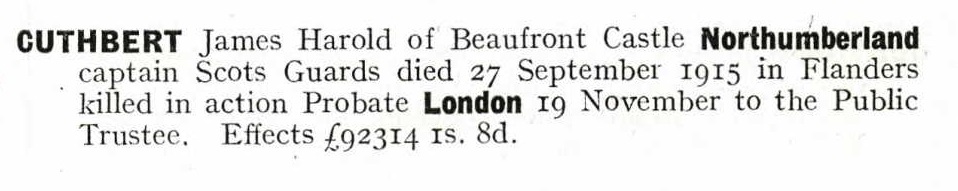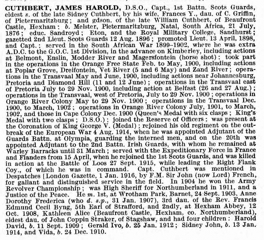 Son of Sidney and Frances Y. Cuthbert. Husband of Kathleen Cuthbert, O.B.E. (now Lady Rayleigh, of Beaufront Castle, Hexham, Northumberland, and Terling Place, Chelmsford). Born Melster, Pietermaritizburg, South Africa. Educated Sandroyd, Eton and Royal Military College. Won the Army Revolver Championship in 1904, and published "The 1st Battalion Scots Guards in South Africa, 1899-1902". His sons Gerald Ivo Cuthbert and Sidney John Cuthbert fell in the 1939-1945 war. |