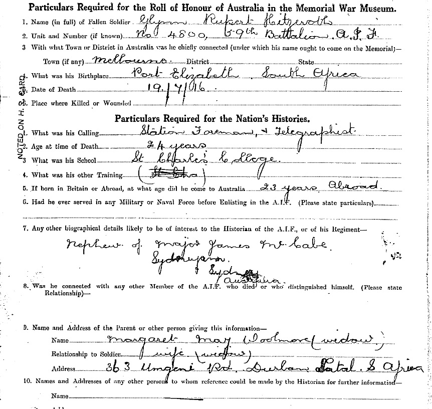 Son of Johan Hendrik Hitzeroth and Isabella Hitzeroth. Husband of Margaret May Woolmore, of 363 Ungeni Road, Durban, Natal, South Africa. Born Port Elizabeth, South Africa.