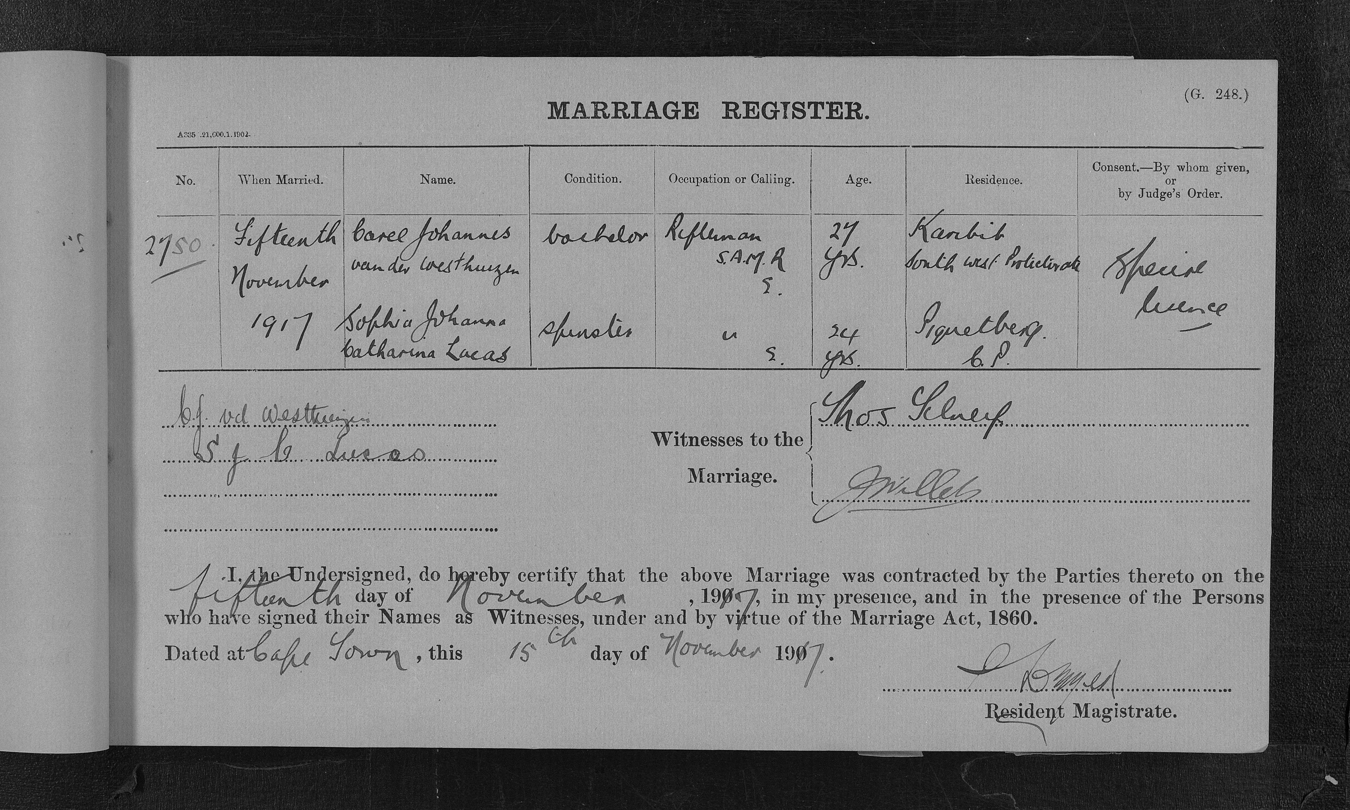 Husband of Sophia Johanna Catharina (nee Lucas) van der Westhuizen. Deserted from Robert Heights Camp 7th June 1918 |