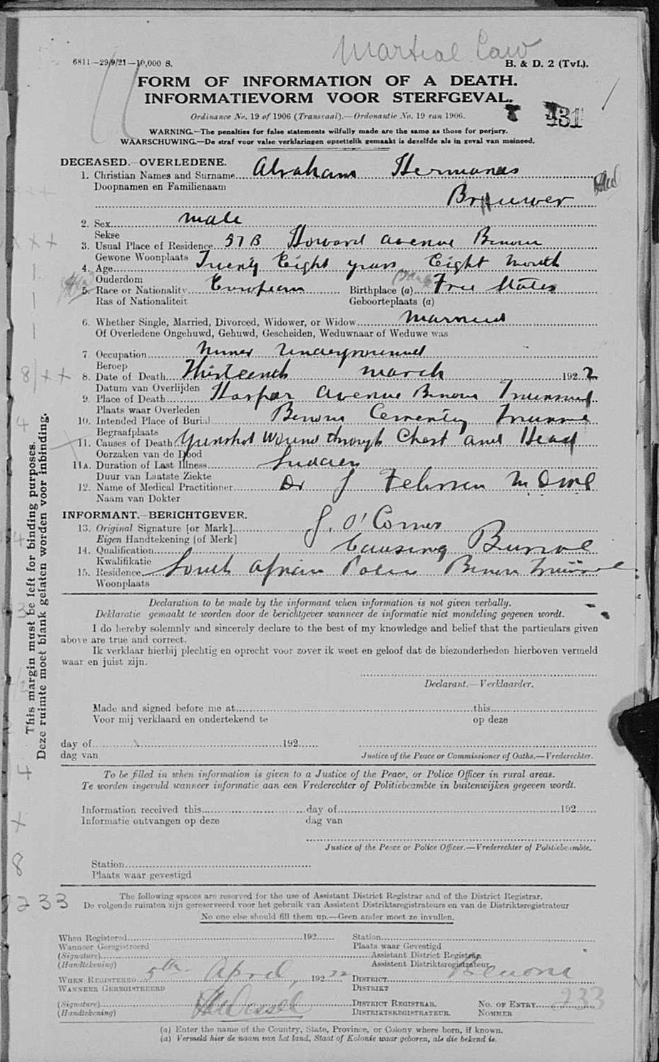 Died of gun shot wounds, chest and head, during Rand Revolt