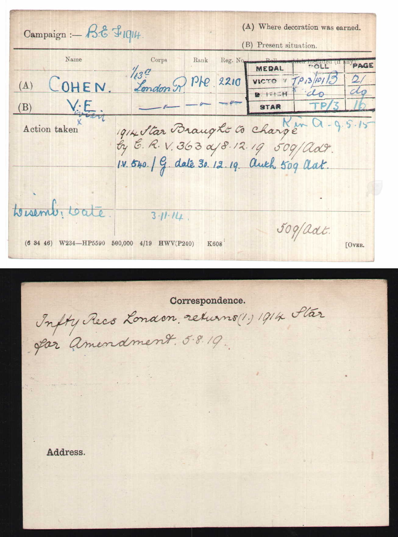 LG Sup 5 August 1915 - "For conspicuous gallantry on the 9th May, 1915, near Ronges Bancs. Private Cohen was the sole survivor of the left bombing party, and although himself wounded, continued to throw bombs with great courage and coolness until too exhausted to move." |