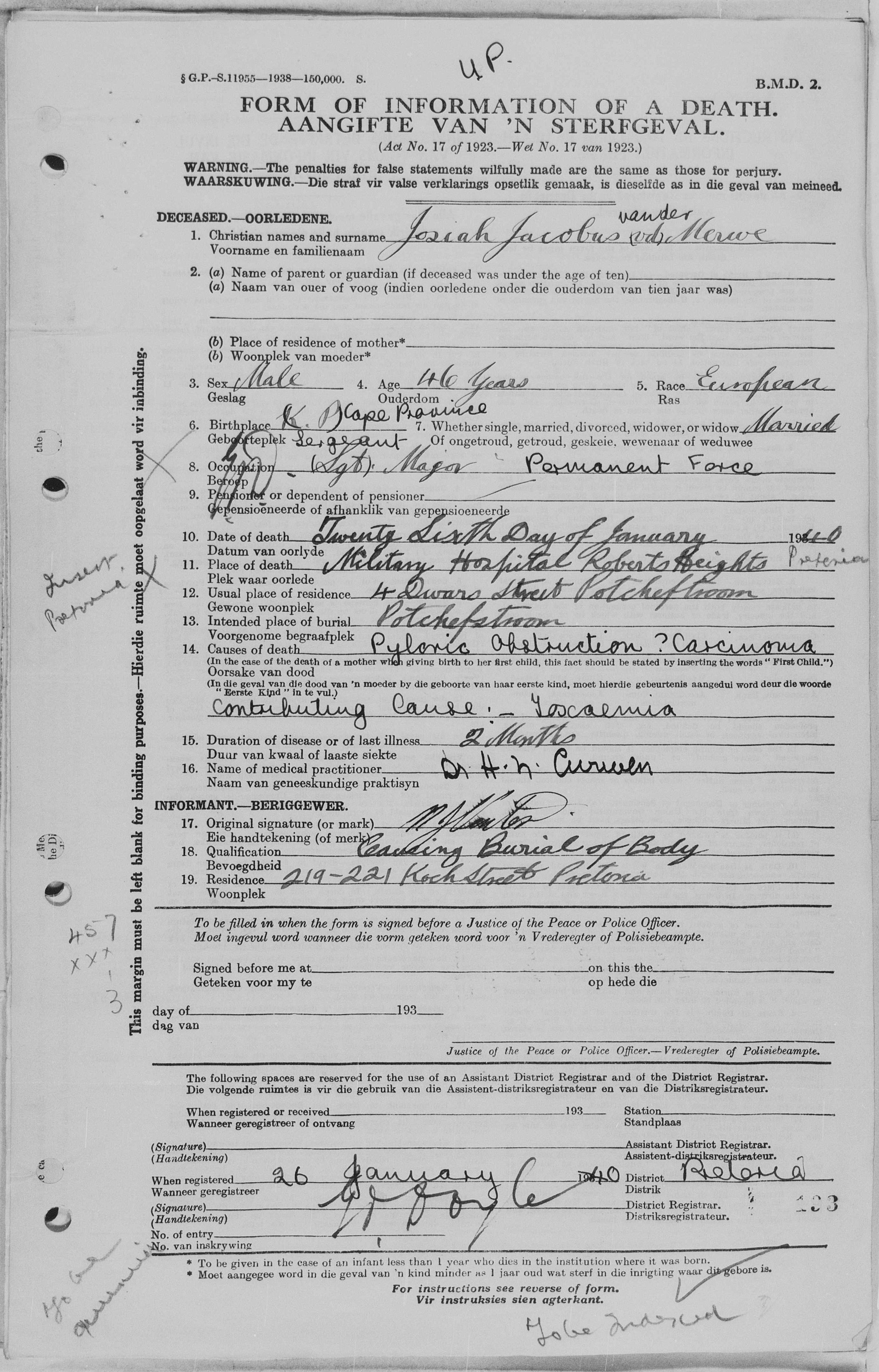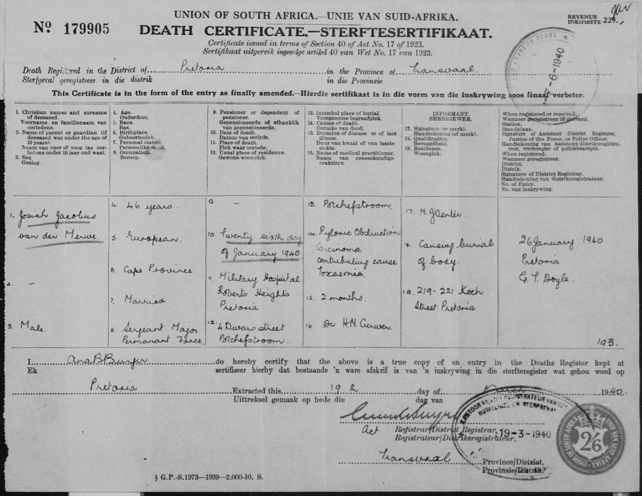 Died of pyloric obstruction carcinoma due to toxaemia, at Roberts Heights Hospital