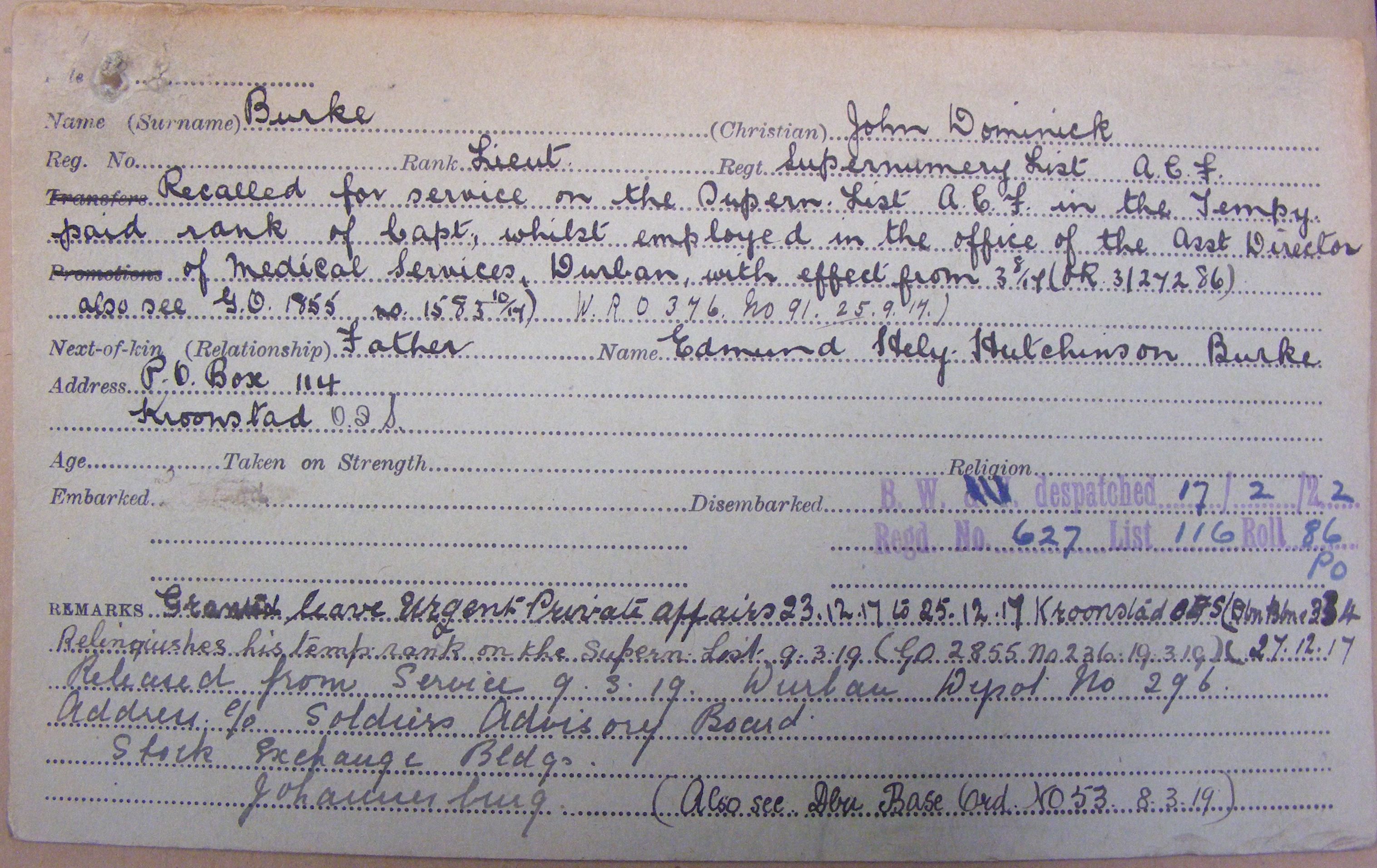 Son of Edmund Hely Hutchinson and Mrs. K. C. Burke, of Kroonstad, Orange Free State. A legal clerk. |
