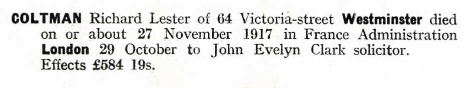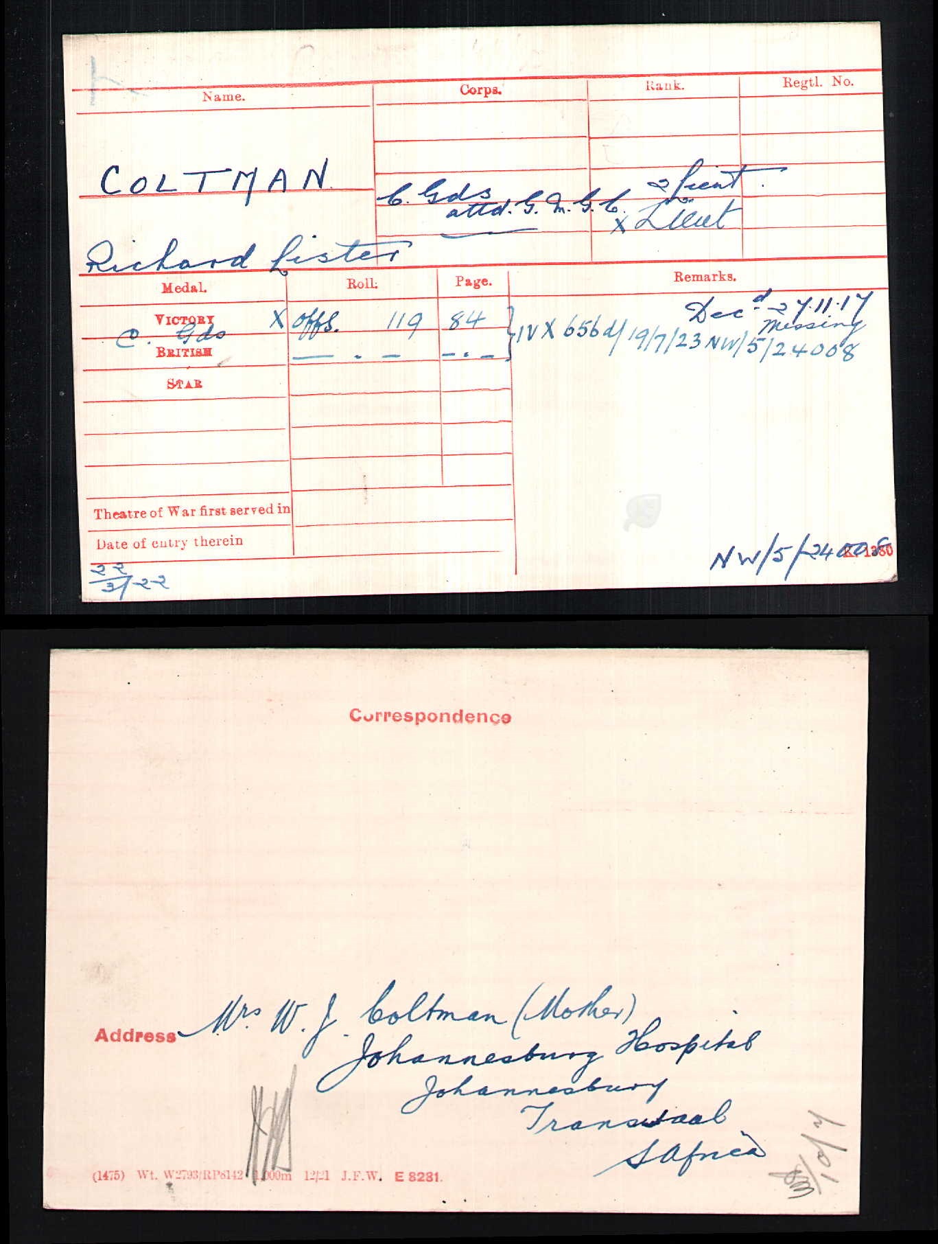 Son of Walter John and Ethel Matilda Coltman, of Johannesburg, South Africa. Born London. Educated at King Edward's School, Johannesburg, Potchefstroom Agricultural College and Emmanuel College, Cambridge, in each of which institutions he gained scholarships. Passed Natural Science Tripos with double honours before joining the Army and gained further scholarships which he did not live to take advantage of. Previously wounded at Ypres in July, 1917. Commemorated on brother's headstone in Johannesburg (Braamfontein) Cemetery |