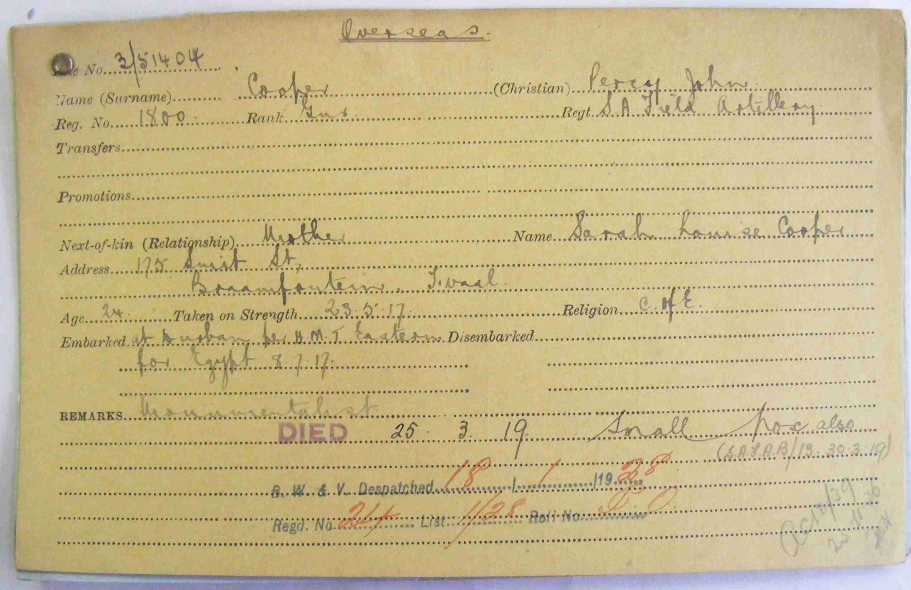 Son of John Thomas and Sarah Louisa Cooper, of 175, Smit St., Johannesburg, South Africa.