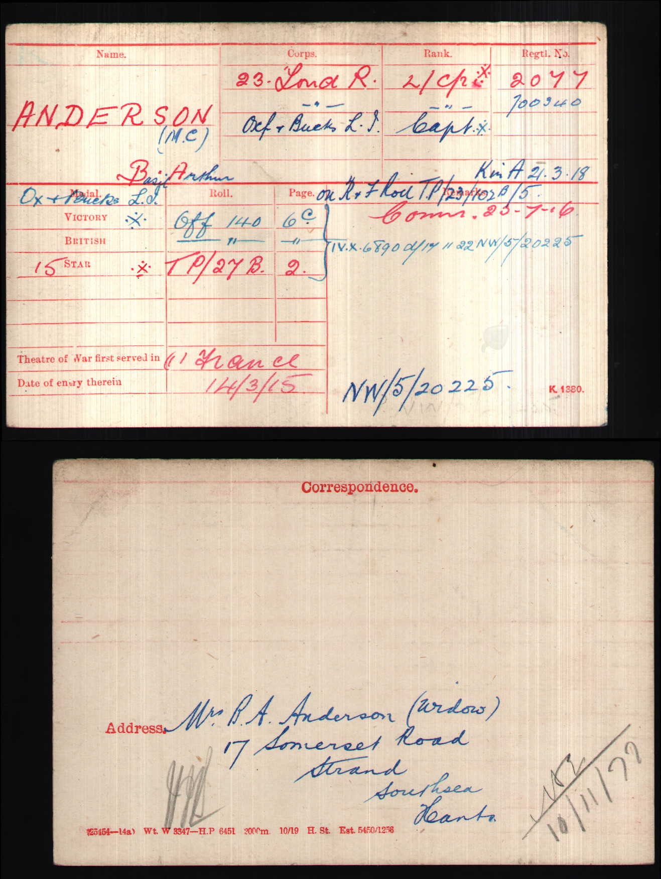 formerly Lance Corporal (#2077 & 700340) with the 23rd Battalion, London Regiment