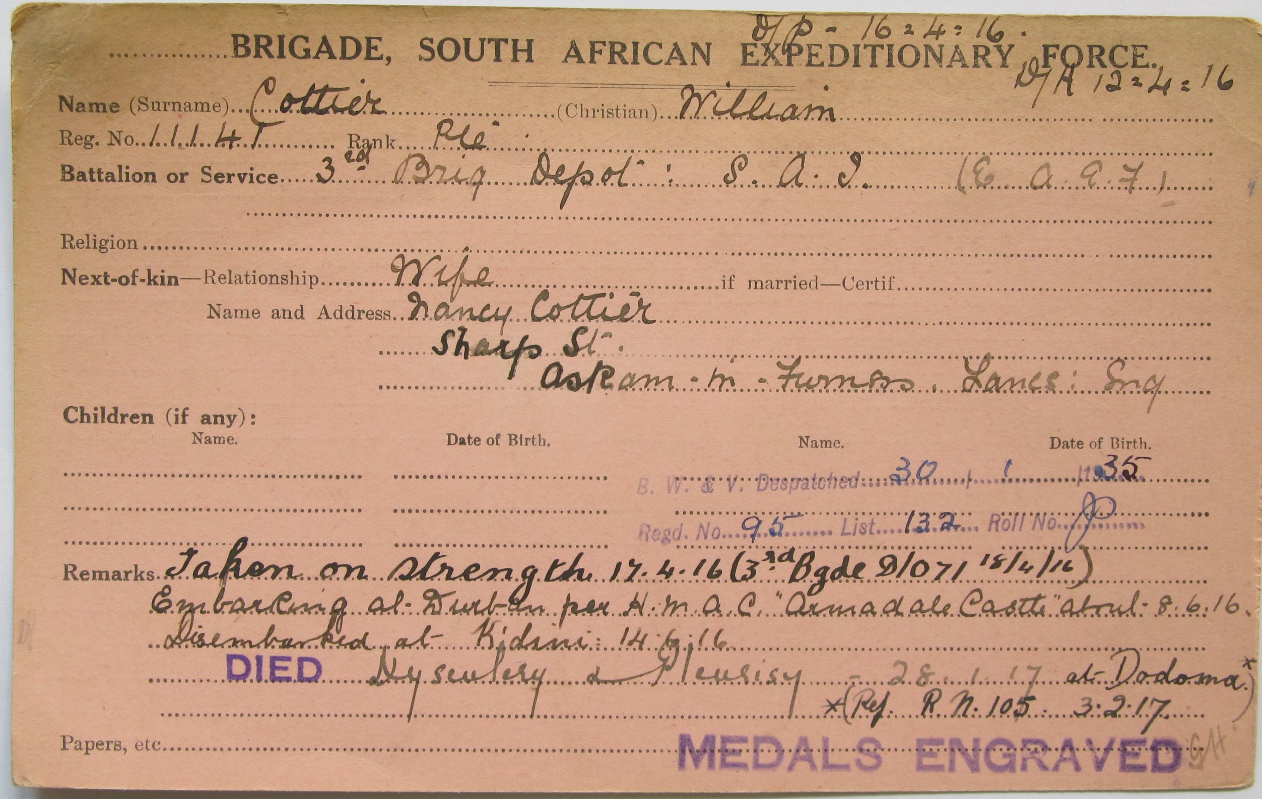 Husband of Nancy Cottier, of Sharp Street, Askam-in-Furness, Lancashire, England. On Askam-in-Furness War Memorial. On Ireleth War Memorial