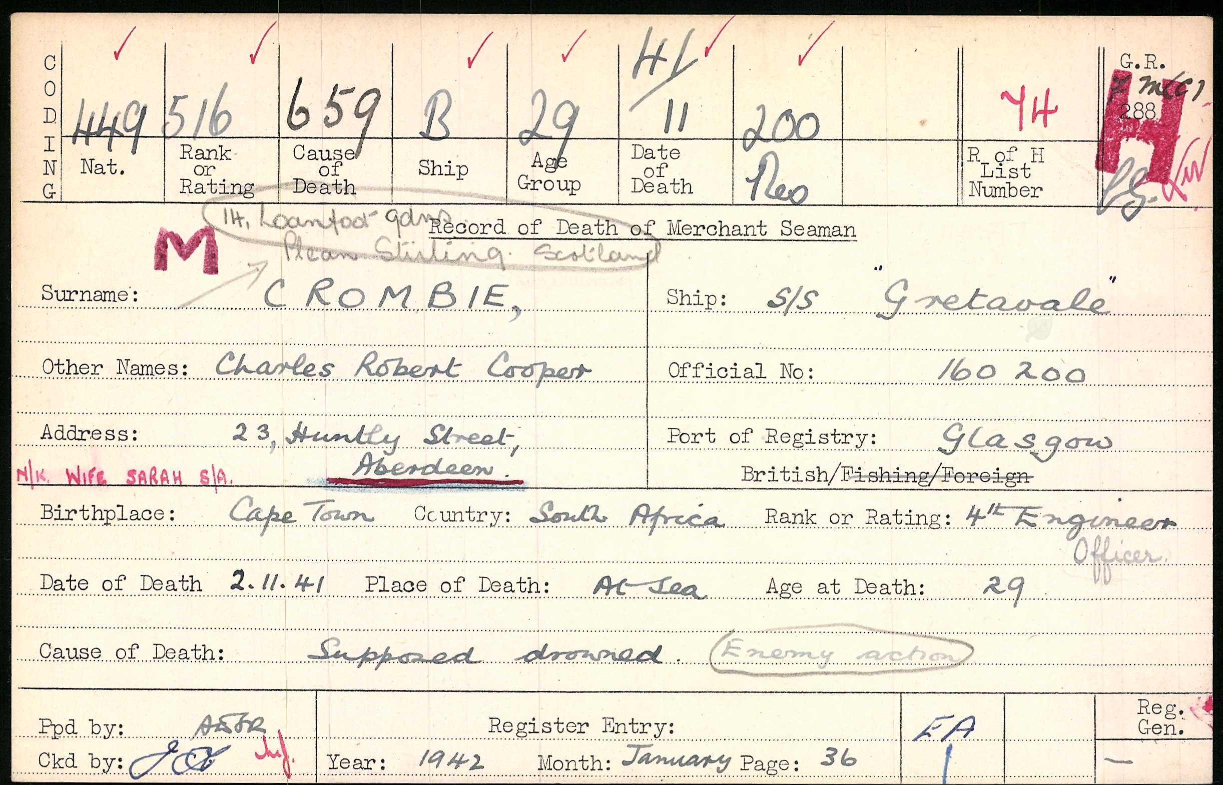 Son of Walter and Edith Crombie; husband of Sarah M. Crombie, of Plean, Stirlingshire. Born 1912 in Cape Town. ref. South African Roll of Honour 1939-45 |