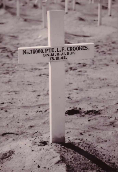 Son of Frank Leonard and Mary Crookes, of Selby Street, Scottburgh, Durban, Natal, South Africa. Born Ladysmith, Natal. Educated Ladysmith High School. A miner in Springs. Commemorated on Natal Mounted Rifles; the Scottburgh and on St. Patrick's Anglican Church, Umzinto WWII Memorials. *** Headstone initials incorrect***